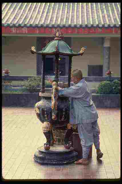 057035 Siong Lim Temple Female Monk Cleaning Joss Sticks A4 Photo Print