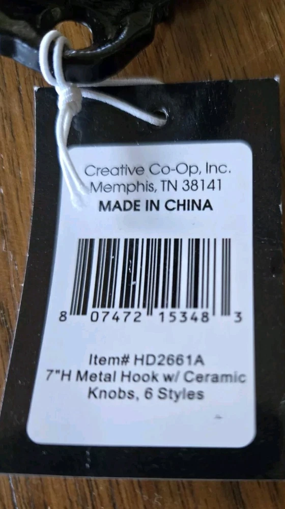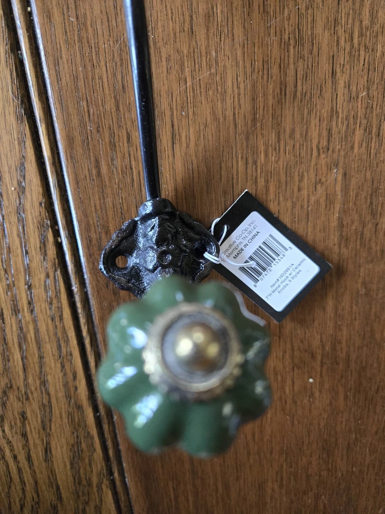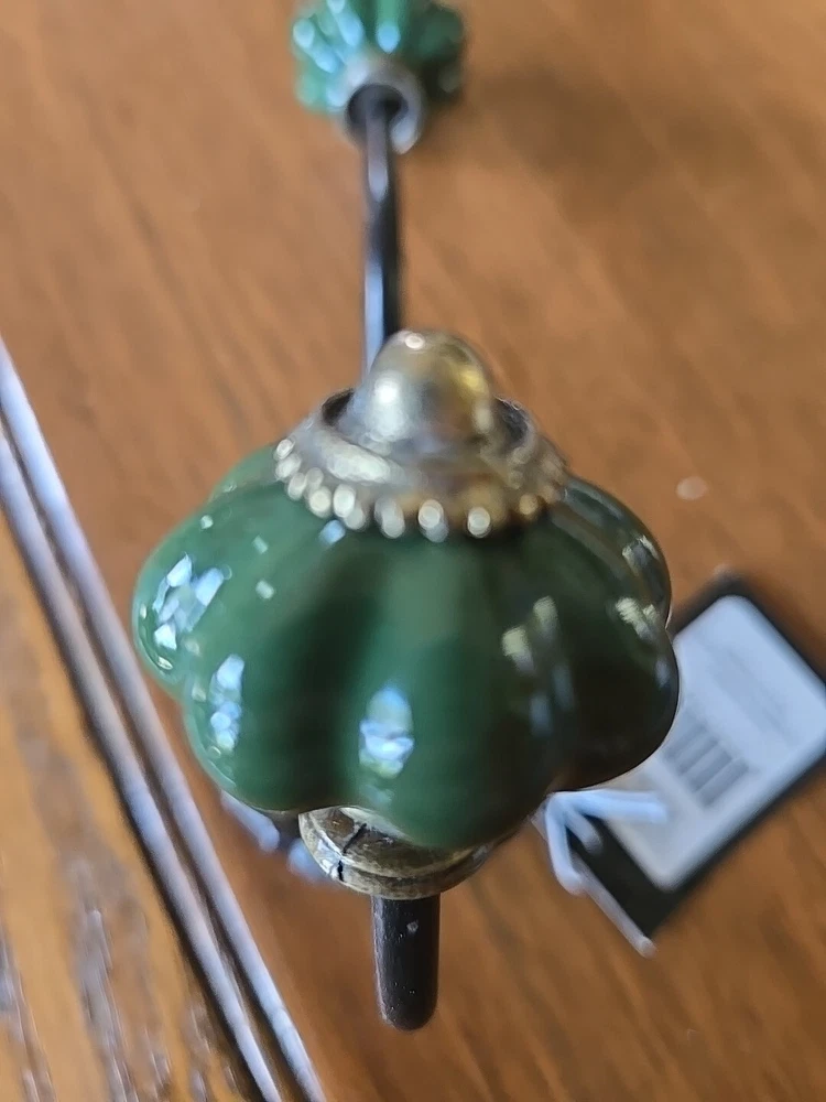 Metal Ceramic Wall Hook "Creative Co-op" Organizer Towel Hat Coat Clothes Hook Dark green ceramic knobs. The approximate length is seven inches extends from the wall, approximately four inches.