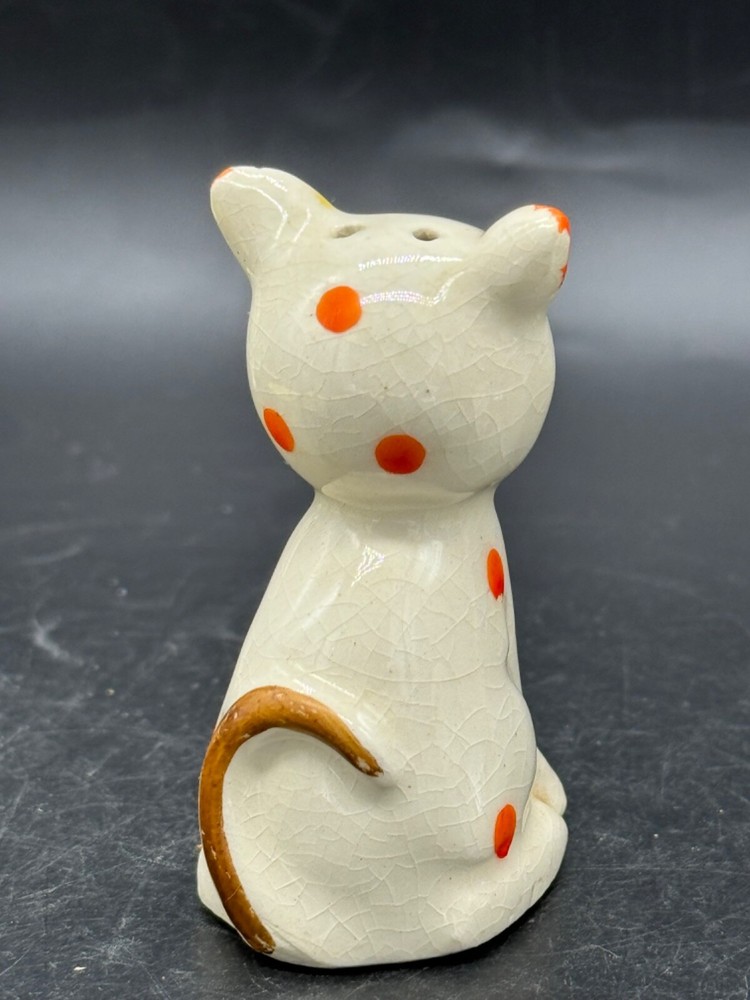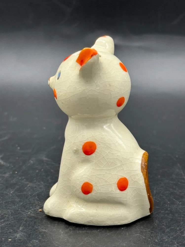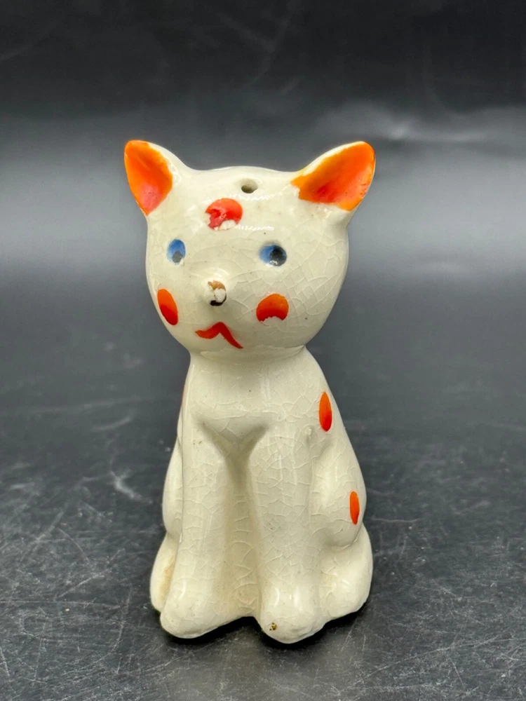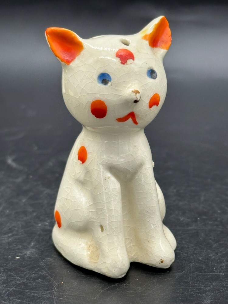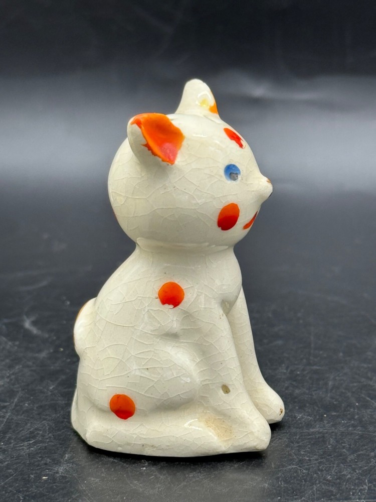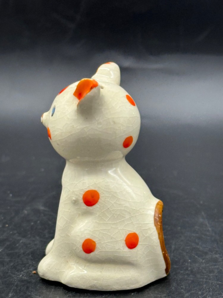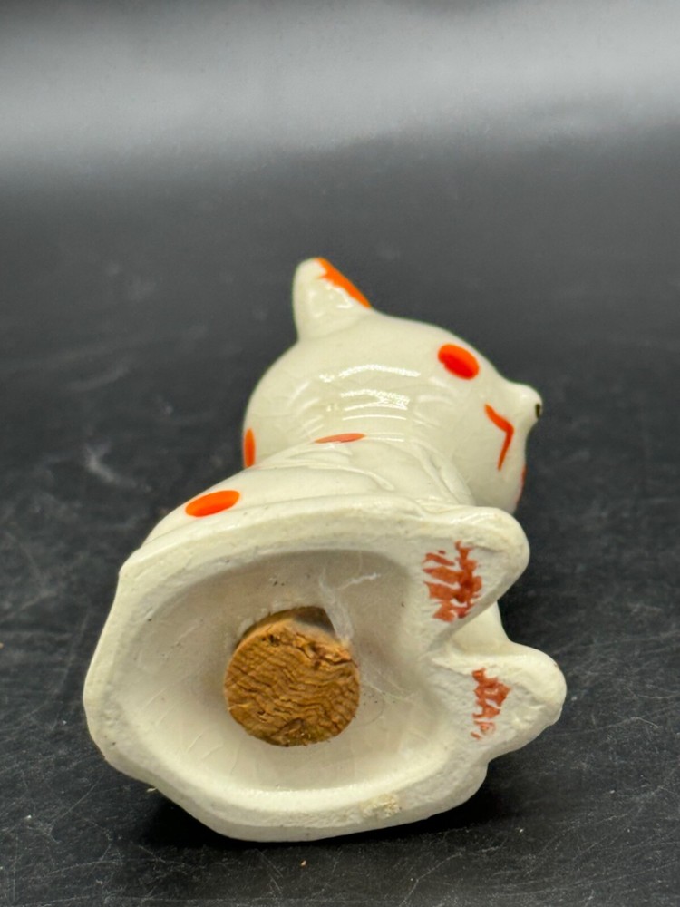 Mid century, ceramic, white cat w / orange dots , blue eyes Cork stopper Japan Measures 2 5/8” high No cracks or chips Very slight crazing and wear on the orange dots on the face, see photos THIS IS A VINTAGE ITEM! s/p 3/17/24