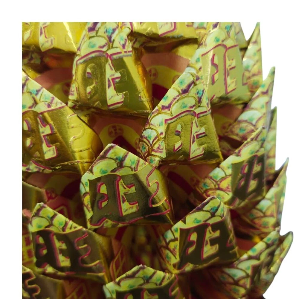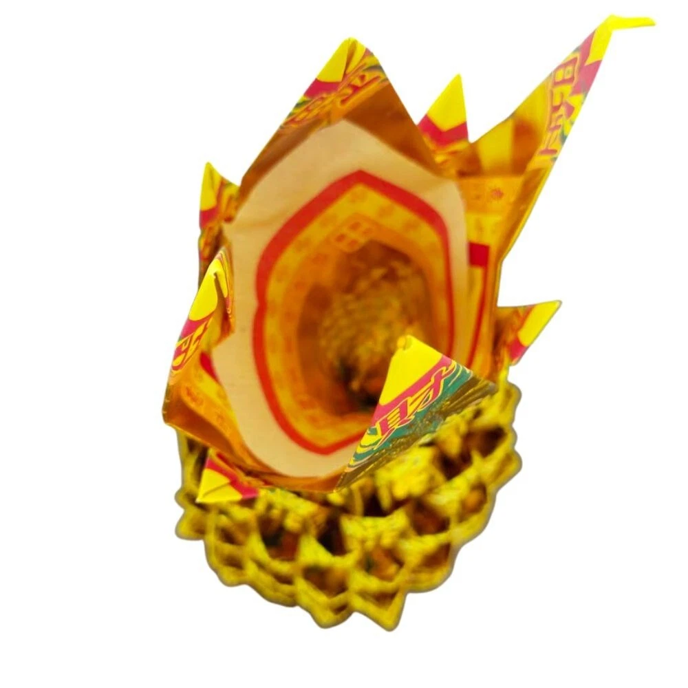Joss paper pineapple is a traditional offering in Chinese culture that is typically burned as an offering to deceased ancestors or as a tribute during important celebrations and festivals. The pineapple is considered a symbol of wealth, prosperity, and good fortune, and burning joss paper pineapples is believed to bring good luck, blessings, and success. Size of Pineapple : 10inch x 6.5inch Color : Gold incense paper Some potential benefits of burning joss paper pineapples include: đź’•Honoring ancestors: Burning joss paper pineapples is a way to pay respect and honor to one's ancestors, and to acknowledge their presence and influence in one's life. đź’•Inviting good fortune: The pineapple is considered a symbol of prosperity and wealth in Chinese culture, and burning joss paper pineapples is believed to invite good fortune and financial success. đź’•Purification and cleansing: Burning joss paper pineapples is believed to purify and cleanse the surrounding environment, removing negative energy and promoting positive energy and blessings. đź’•Expressing gratitude: Burning joss paper pineapples is also a way to express gratitude for blessings received and to seek continued blessings and protection from one's ancestors and deities. It's important to note that while burning joss paper pineapples is a longstanding tradition in Chinese culture, it is a form of spiritual practice and should be approached with respect and sensitivity.