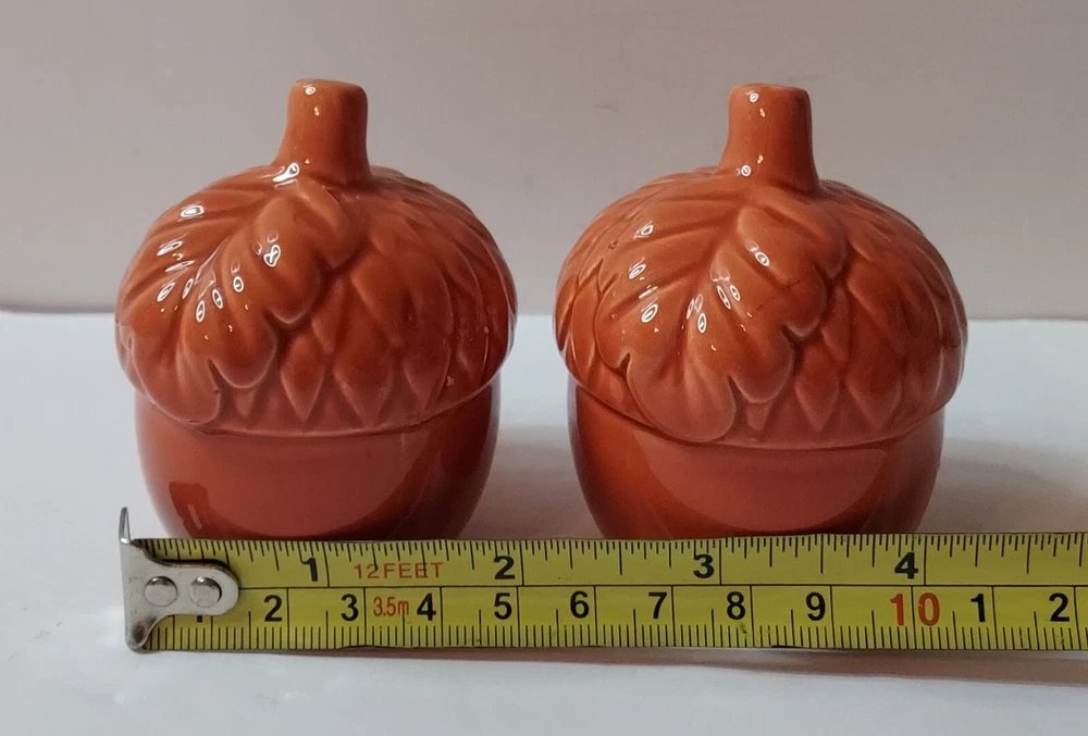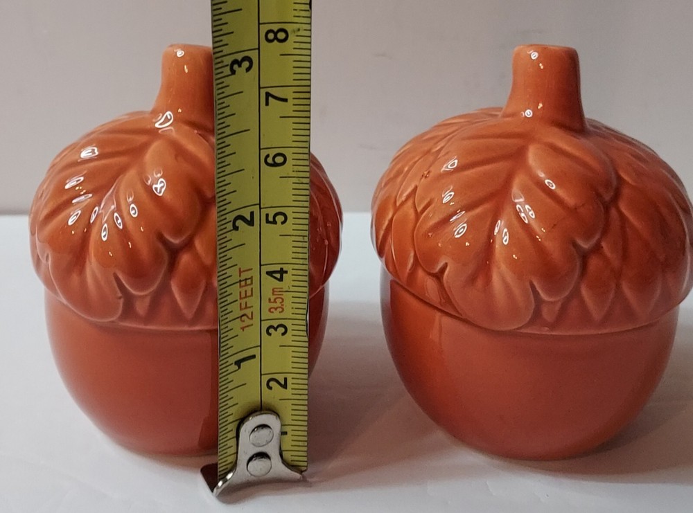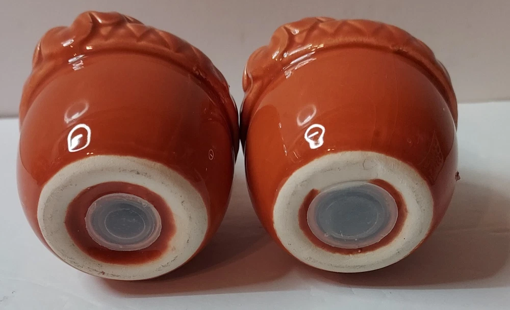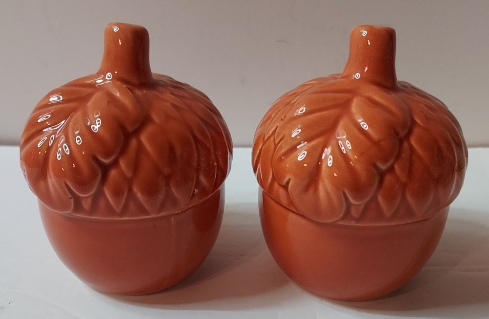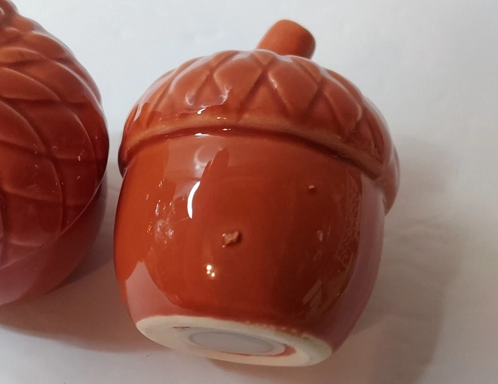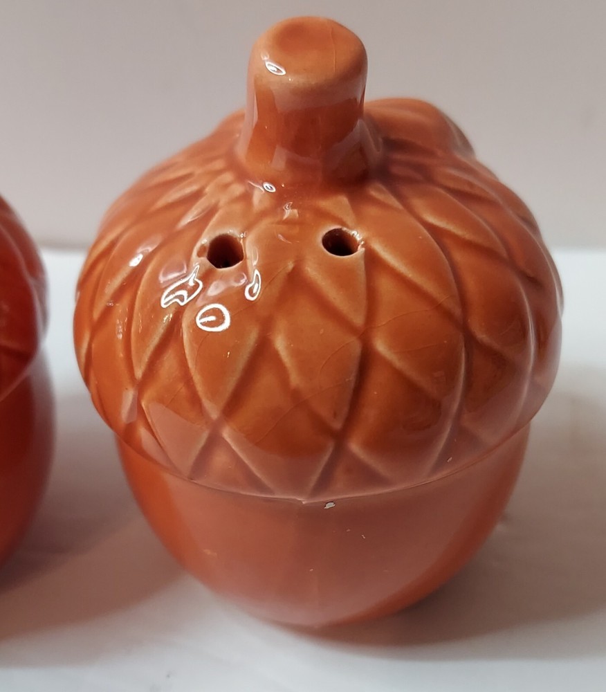 Add a touch of vintage charm to your kitchen with this set of 2 ceramic and porcelain salt and pepper shakers shaped like acorns. The mid-century modernism style shakers are perfect for your fall occasion and feature a lovely orange color. They weigh 4.2 oz and measure 3 inches in height and 2 1/4 inches at the top. This set, which includes a salt and pepper shaker, is ideal for any adult who loves to add a touch of uniqueness to their home decor. The shakers are compatible with all kinds of food, and they are perfect for collectors and enthusiasts of kitchen tools and gadgets. Buy now and add them to your collection! These are pretty, but do have some manufacturers flaws. No cracks . See pictures of higher spots.