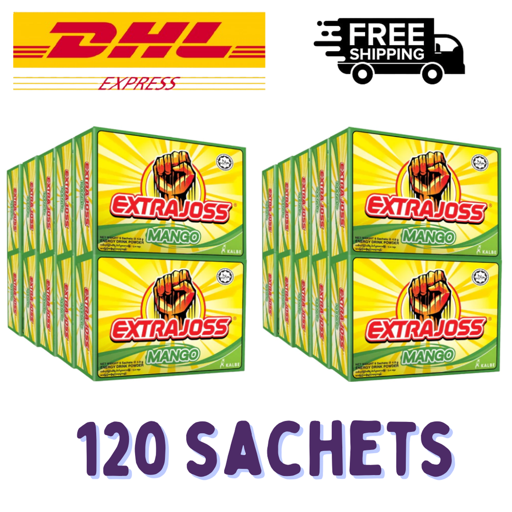 20 Boxes = 120 Sachet EXTRA JOSS MANG0 (4g per sachet) Product Description : Extra Joss is designed for an active lifestyle. It will recharge your working day, and is abrilliant pre-sport or workout power up. The Grape flavour tastes great and is SUGAR FREE The ‘Active‘ ingredients work in synergy to assist metabolism, stimulate confidence, increase physical endurance, overcome fatigue, sharpen the senses, enhance reaction speed… and for some, it helps lift hangover haze. There are six single serve sachets per pack. Each sachet makes a 300ml effervescent energy drink. Added to a glass or bottle of water, it dissolves rapidly, and is ready to drink in seconds. Dilute to your own taste. It’s the real thing Extra Joss is formulated using Ingredients found in other leading RTD energy drinks and includes: Caffeine, Taurine, Thiamin, Riboflavin, Inositol, Niacin, and other B vitamins. It’s Sugar Free and contains Ginseng and Royal Jelly. Shipping & Handling Details Free Expedite shipment to US!! The product is well packed using bubble padded envelope/boxes to protect product from damages The product will be shipped using DHL EXPRESS with Tracking Number . Tracking number will be provided to customers. Fast Handling Time 1 - 2 Business Day Shipment notification will be given to the customer once the product is ready to ship. For Worldwide International Shipment , please allow 2 - 5 business day days for your item to arrive. Customer’s Notes We kindly invite you to share your POSITIVE FEEDBACK with us. Your satisfaction is our top priority, and we are committed to delivering exceptional service. Additionally, rest assured that we provide comprehensive after-sales support to ensure your continued satisfaction “ Your satisfaction is our priority”