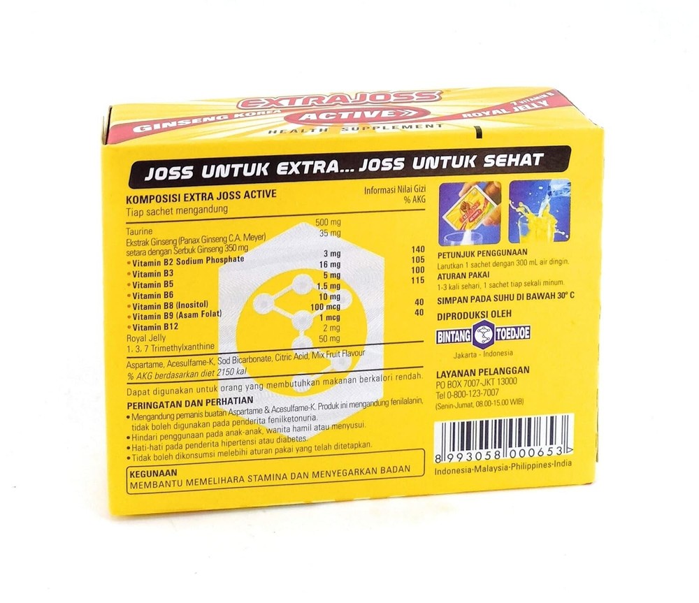 100% ORIGINAL EXTRA JOSS ENERGY DRINK 20 Boxes(120 SACHETS) FAST DELIVERY(HALAL) Product Description Extra Joss is a refreshment drink that give fruity taste, with additional benefit of Power from Extra Joss endorsement - Boost Body's Immune System - Royal Jelly Helps Enhance Immune System - With Vitamin B6,B9 and B12 Extra Joss is designed for an active lifestyle. The 'Active' ingredients work in synergy to assist metabolism, stimulate confidence, increase physical endurance, and overcome fatigue. Extra Joss is designed for an active lifestyle. It will recharge your working day, and is a brilliant pre-sport or workout power up. The tropical fruit flavour tastes great and is Sugar Free. The 'Active' ingredients work in synergy to assist metabolism, stimulate confidence, increase physical endurance, overcome fatigue, sharpen the senses, enhance reaction speed and for some, it helps lift hangover haze. There are six single serve sachets per pack. Each sachet makes a 200ml effervescent energy drink. Added to a glass or bottle of water, it dissolves rapidly, and is ready to drink in seconds. Dilute to your own taste. It's the real thing Extra Joss is formulated using Ingredients found in other leading RTD energy drinks for less than half their prices and includes the same ingredients like Caffeine, Taurine, Thiamin, Riboflavin, Inositol, Niacin, and other B vitamins. But it is Sugar Free and contains Ginseng and Royal Jelly. Directions : - Take and tear 1 sachet of Extra Joss - Pour the powder in to glass - Pour cold water (300 ml) to the glass - The powder will dissolved immediately - Serve it immediately while chilled Storage Instruction : - Store below 30°C EVERY BOX CONTENT 6 SACHET : 20 BOX = 120 SACHET SHIPPING + TRACKING NUMBERS : Items are ship from Malaysia by DHL Express to provide you a safe, secure and fast delivery. For shipment to Remote Area there will be additional charges depend on your address. We will contact you to confirm the charges to your area if applicable. Dispatch time is usually in 1-3 business days. Items will take around 4-7 business days to arrive if there are no problems caused by e.g. weather events, customs or operational backlogs. Items will be packed properly to avoid damage during shipments. Shipping tracking number will be provided to buyer. To ensure a smooth delivery/transaction, please make sure your shipping address is verified and correct. We are not responsible for invalid addresses. Worldwide shipping is available. Customs Duties : Please note that the custom duties and tax are not included in the product price and shipping price. All custom duties and taxes, if any (by your country's customs) will be borne by the buyer and payable at the destination . We accept Payoneer only. If you have any problem with the order, do contact us first via ebay message. We will solve the problem as soon as possible. We appreciate it if you could leave us a positive feedback when you are satisfied with your purchase. Your positive feedback really helps us as a seller and we will strive to continue providing good service. We hope you could refrain from leaving a neutral or negative feedback, please let us know first so that that we can solve the issue amicably. We will try our best to solve the problem. THANK YOU STAY SAFE & HAVE A NICE DAY!!!