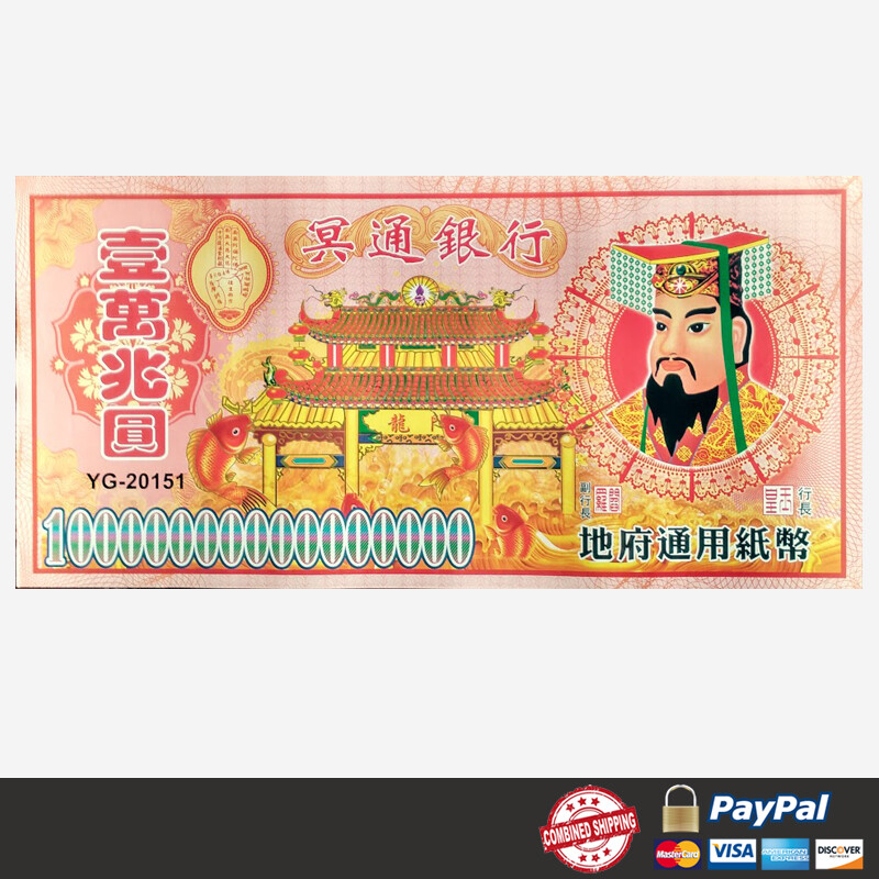 FREE SHIPPING TO USA (EXCEPT RURAL AREA)! πJoss paper money notes Chinese heaven hell money notes π 1 pack 120 sheets SUPER GIANT HELL NOTE π 10 Quadrillion Ancestor Hell Note π Paper Size: 18.75 inch x 9.25 inch . this is really huge! π T hey are also commonly burned as offerings for ancestors and requests for blessings of prosperity and good fortune. π§‘The notes are used to burn for the 'Hell Gods,' offering them monetary distraction so they will leave mortals at peace. π Suitable use on Funerals, Ancestor Birthdays and Death Anniversaries, Qingming Festival, Hungry Ghost Festival, Daily Life Product Description β Ancestor Money or Joss Paper offering is a beneficial practice for yourself and the ancestors. β When our loved ones transition, they still need things in the afterlife. One of these things is ancestor money to help dissolve debt in this realm and beyond! β Burning Ancestor Money on your altar is a very easy practice that yields phenomenal benefits. You can burn one or more bills everyday, on set days, or whenever you can. β These hell notes feature an image of the Jade Emperor, the presiding monarch of heaven in Taoism. β The notes are used to burn for the βHell Gods,β offering them monetary distraction so they will leave mortals at peace. β They are also commonly burned in Asia as offerings for ancestors and requests for blessings of prosperity and good fortune.