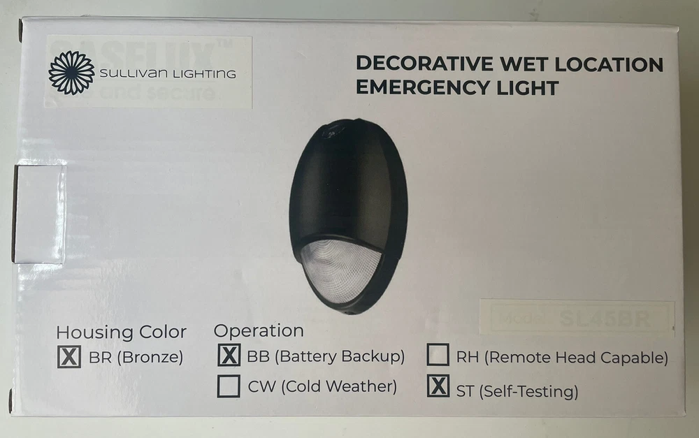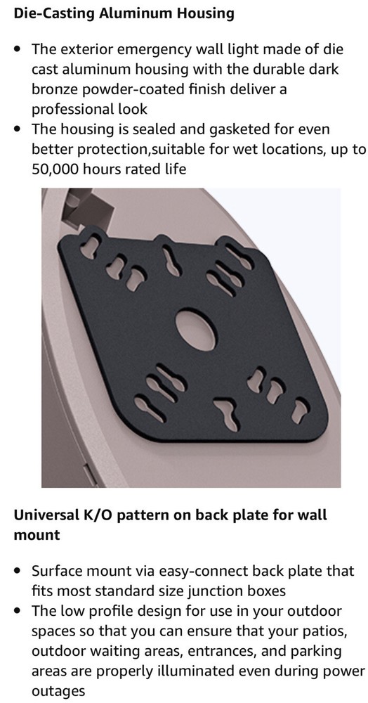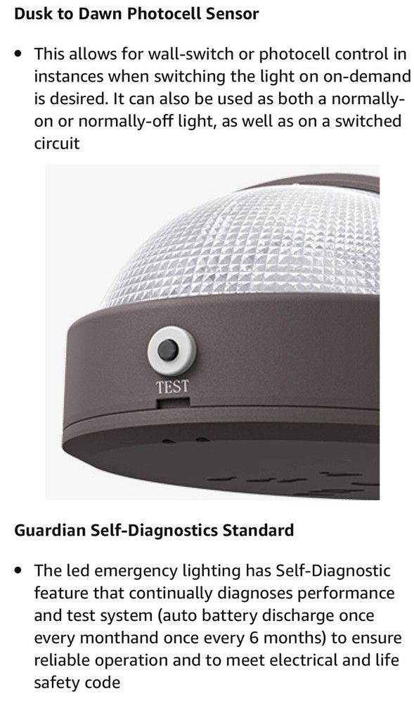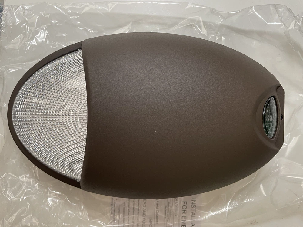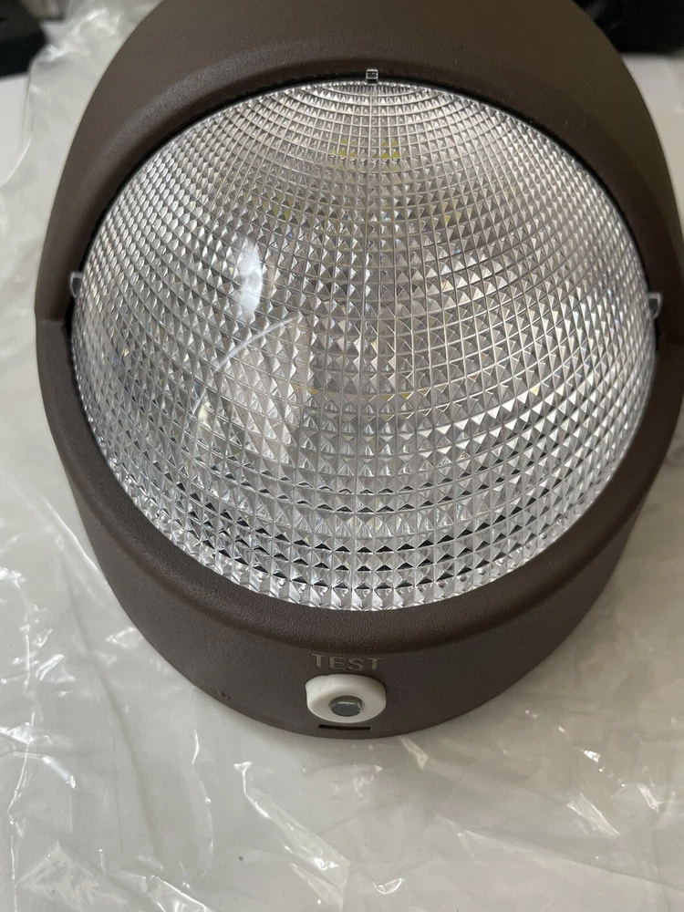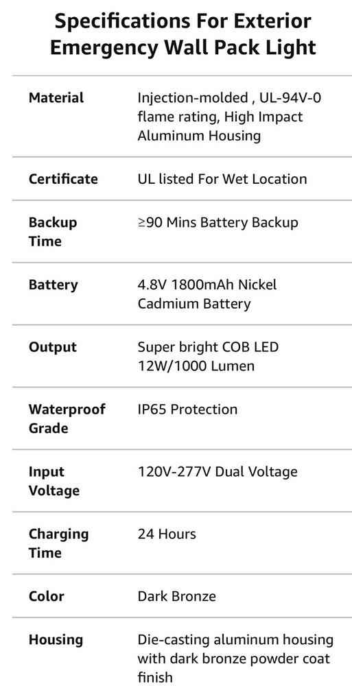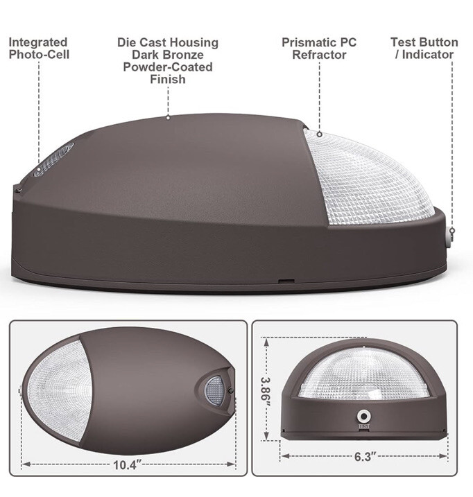 LED emergency light with 90 minute battery back up and dusk to dawn photo cell sensor, bronze colored wall pack waterproof with test button. Residential or commercial exterior aluminum emergency wall light one 120-277 UL listed Meets N.J.A.C. 5:70-4.1(I)