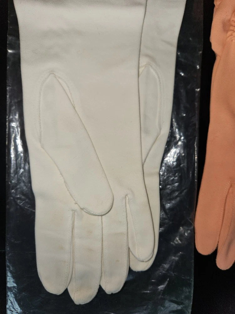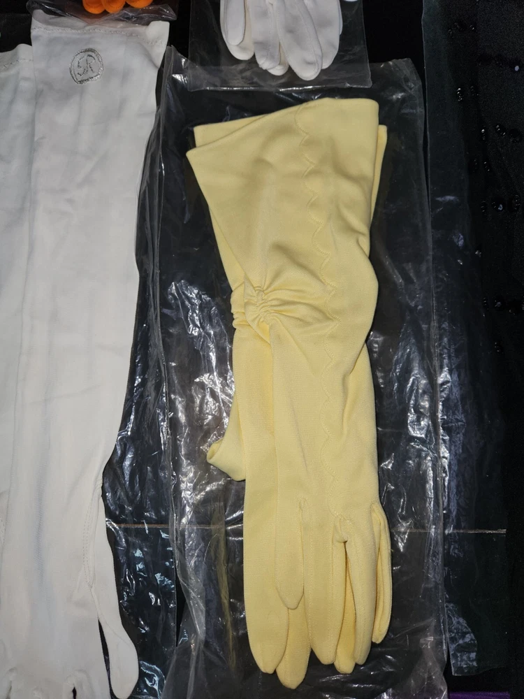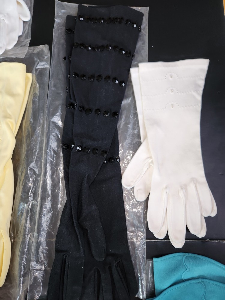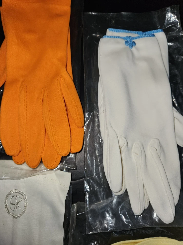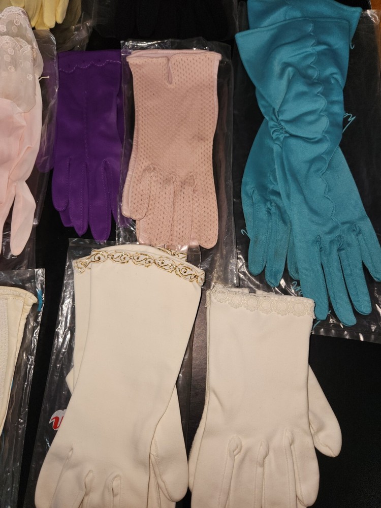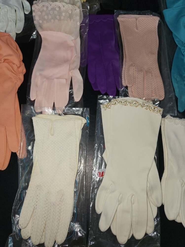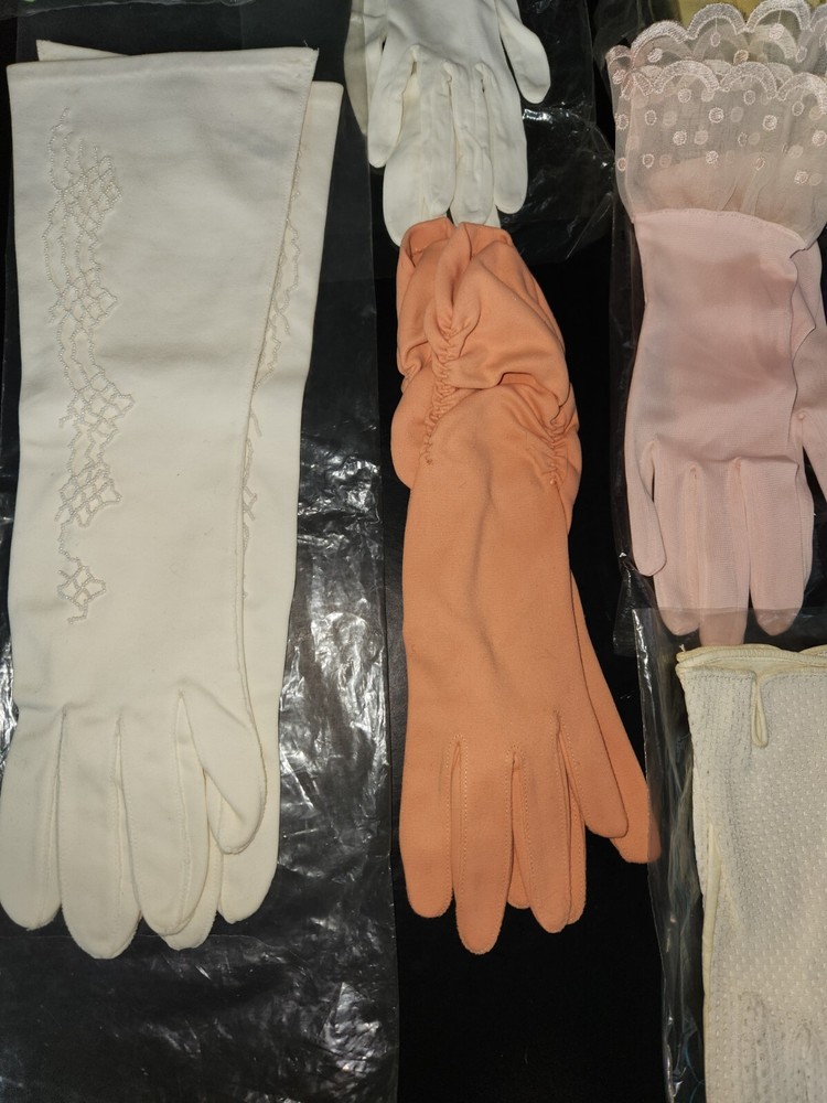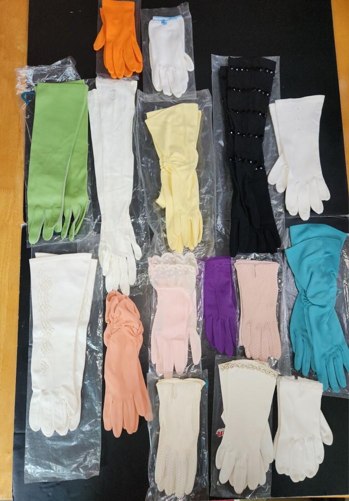 16 Pc. Vintage Mid Century Women's Glove Lot Beaded Pink Turquoise Purple Orange. Offering a 16-piece mixed lot of gloves. Mix of fabrics. A few are leather/pleather. Some are nylon and linen. Some are in their original bag. Sizes are mostly extra small & small. Various lengths for different occasions. Some have special additions such as beads, scalloped detail, gold accents, and one pair is monogrammed "SR." Overall, each is in like-new to very good condition. A few have some discoloration staining, and a few have been worn. Please inspect photos and message me for questions before buying.