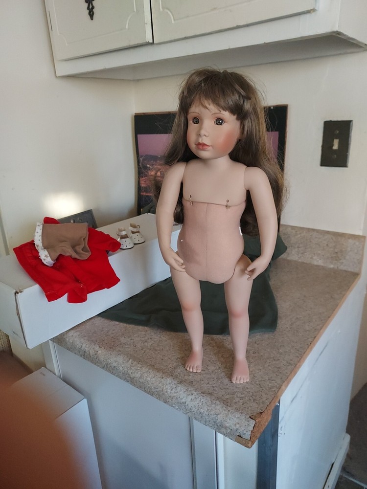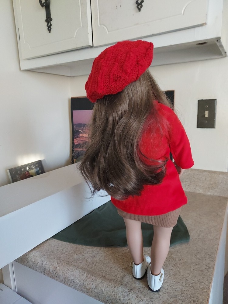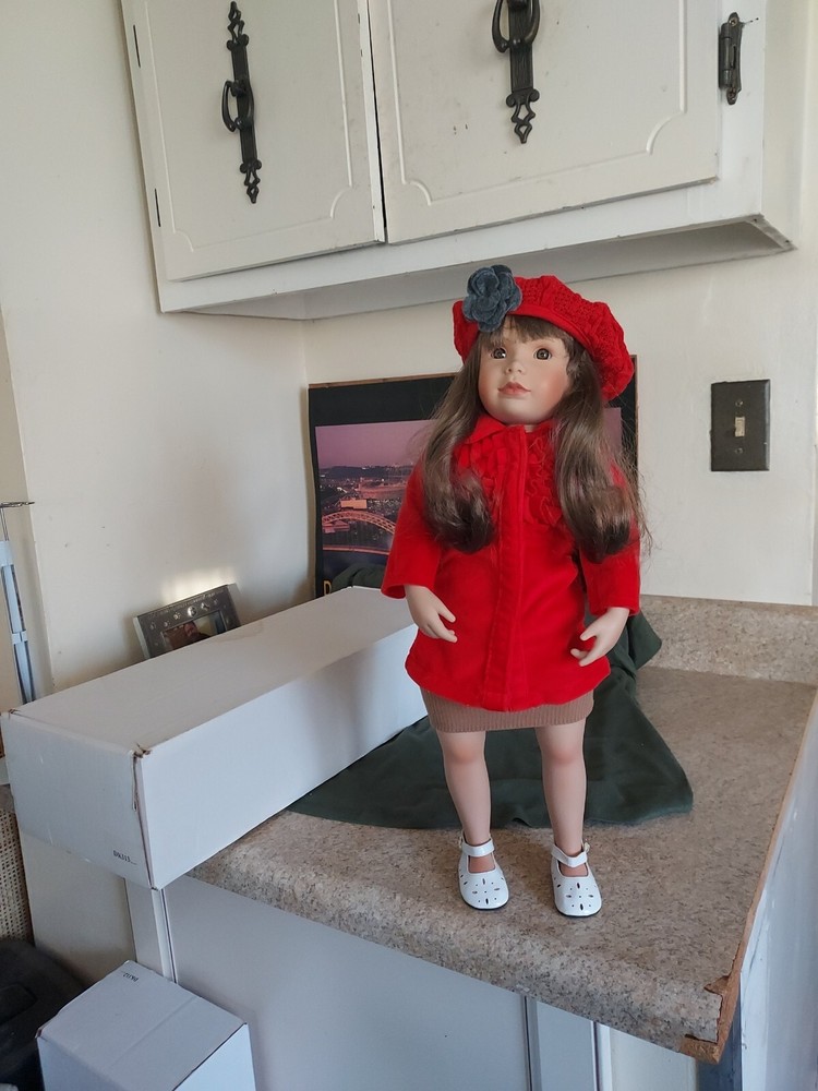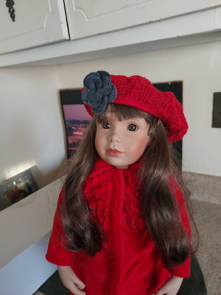 18" Porcelain Doll 1996 By Creative Doll Co By Maryanne Oldenburg With Box. This doll is in good condition. Her shirt and hat are made by American Girl and her skirt is recycled from a cuff on a sleve.