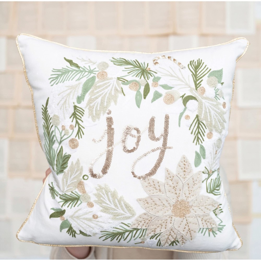 Throw pillows are a brilliant and easy way to change the look of a couch, chair or any furniture piece in the home or office. They instantly add personality and depth to the living space. Bring holiday cheer to the room décor with this seasonal pillow for a fresh new look. Square cotton pillow with beads, wreath, embroidery and "joy" detail Add to a seasonal display for a dash of cozy winter charm Cover: 100% Cotton, Filling: 100% Polyester 18"L x 18"W x 3"H Curate an inviting holiday design scheme that reflects your unique sense of style with intentionally designed seasonal décor