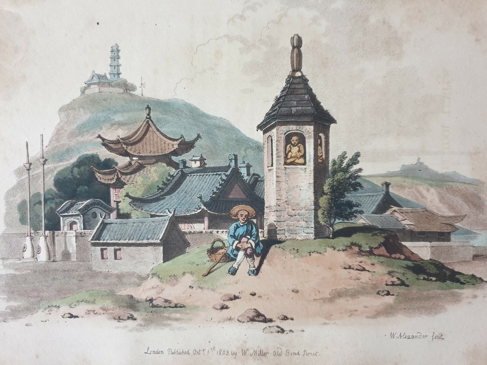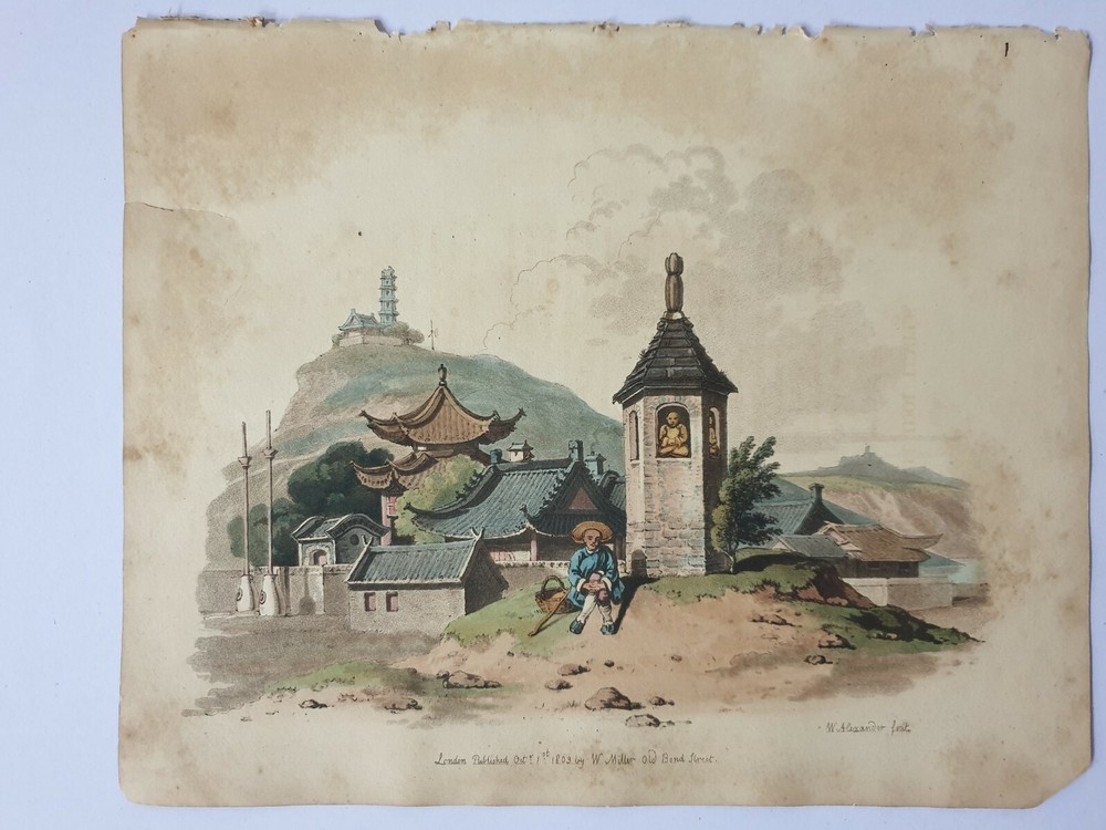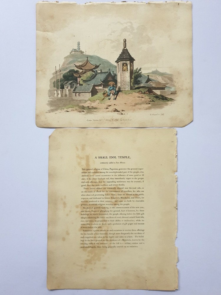 1803 Aquatint SMALL IDOL TEMPLE Called Joss House COSTUME CHINA 10in x 12.50in The Costume of China, a series of 48 aquatints etched by Alexander himself, with commentary, published by William Miller in 1805, with some plates dated as early as 1797. The plates show individual figures, figure groups and architectural structures. Ex Book. May have slight worming. Slight age toning commensurate with age Shipping by registered air mail. Item 8348