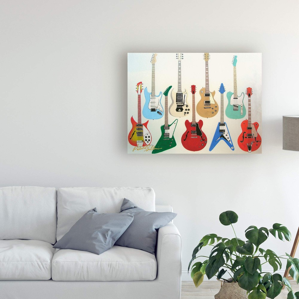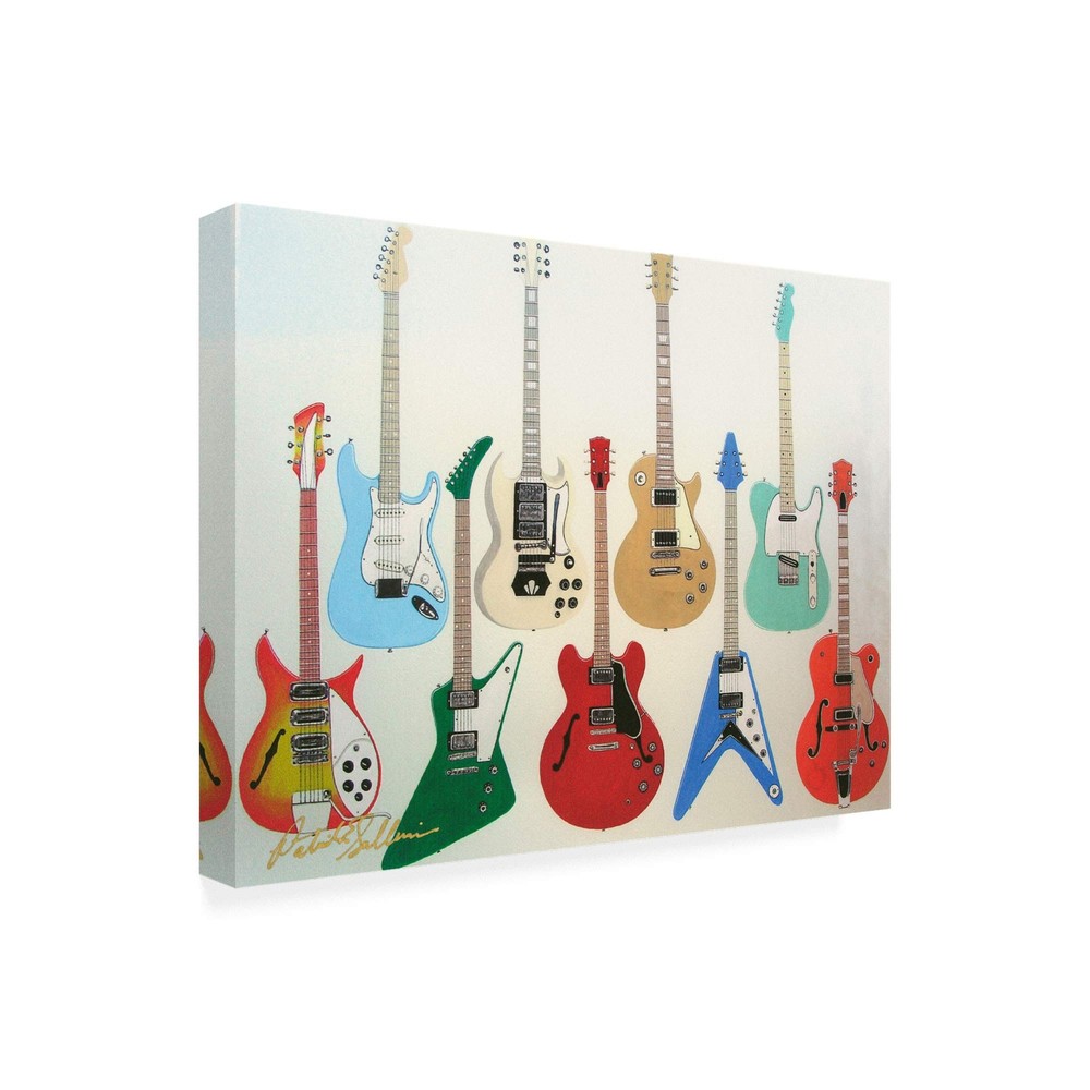 This ready to hang, gallery-wrapped art piece features guitars line up next to each other over white. Prominent Colors: White, Grey, Red, Tan, Green, Light Blue, Turquoise Patrick lives in Wilmington, NC, with his wife Susan, their daughter Niki, 3 dogs & 2 cats. They also have sons and grandsons. Patrick is a self-taught watercolorist with an extensive background in drafting, commercial art and engraving. “Years of training in the commercial arts have taught me to paint exactly what I see”, says Patrick. “However, watercolor is such an expressive and unpredictable medium that I am always excited about the outcome of each new painting and what the finished work will communicate to others.” Patrick has published over 80 prints to date, both open and limited editions. Giclee (jee-clay) is an advanced printmaking process for creating high quality fine art reproductions. The attainable excellence that Giclee printmaking affords makes the reproduction virtually indistinguishable from the original piece. The result is wide acceptance of Giclee by galleries, museums, and private collectors. Gallery wrap is a method of stretching an artist's canvas so that the canvas wraps around the sides and is secured a , wooden frame. This method of stretching and preparing a canvas allows for a frameless presentation of the finished painting. Artist: Patrick Sullivan Subject: Music Style: Modern & Contemporary Product Type: Gallery-Wrapped Canvas Art Made in USA