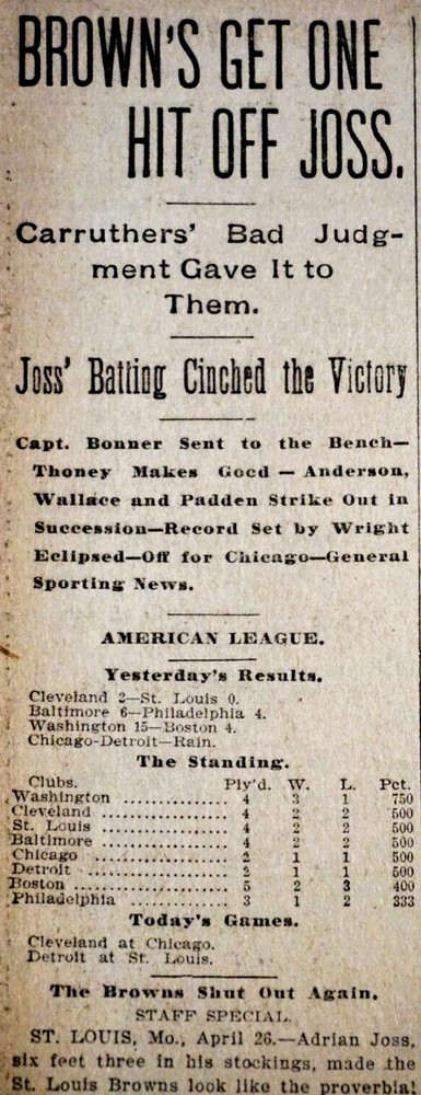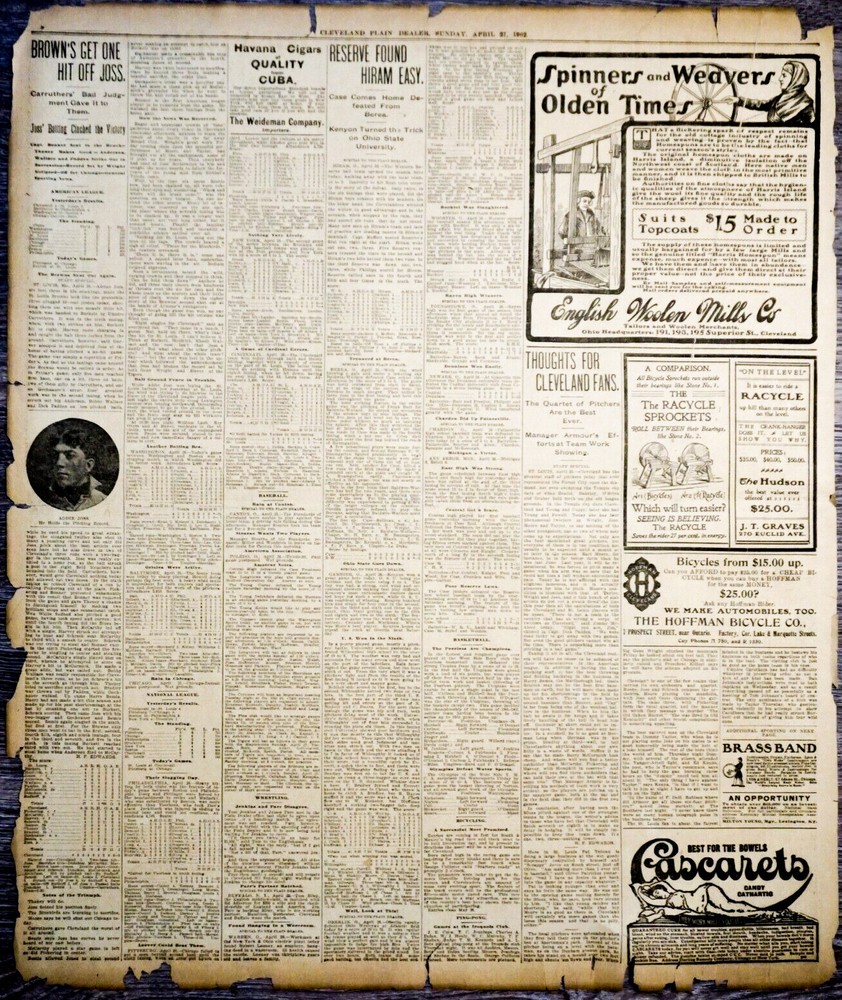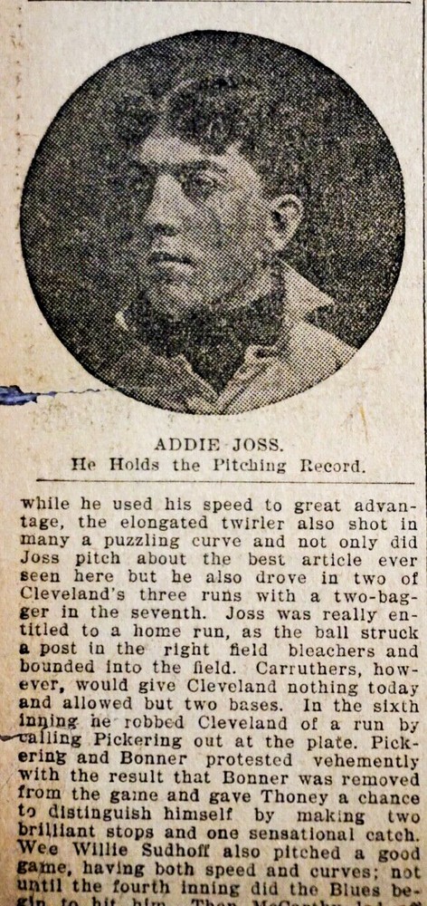 Available is a rare Cleveland newspaper page that covers the major league debut of Hall of Fame Cleveland Bluebirds pitcher Addie Joss.I his major league debut, Joss tossed a 1 hitter vs. the St. Louis Browns. Condition This newspaper page is in fair condition. The page should still be treated as delicate and handled with care upon receipt. This newspaper page originally came from a bound library volume and exhibits above average chipping and paper loss on the edges. Additional minor paper loss could occur during shipment. Domestic Shipping The page will be placed in a clear plastic sleeve and gently rolled and inserted into a sturdy cardboard tube. Single newspaper pages can be shipped via First Class Mail. Please specify if expedited Priority Mail is desired. I will combine shipping but additional newspaper pages may require Priority Mail shipping due to total package weight. International Shipping I can ship several pages using First Class International Postage. Any additional pages may require Priority Mail International shipping depending on total package weight. Multiple Purchases and Combined Shipping I do combine shipping. If you purchase multiple items from my "Buy It Now" inventory, please add each item to your cart on the listing home page and when finished check out and request a total from me. If you win multiple auctions, please don't pay for each item individually. I will send you an invoice with a combined shipping amount for all of your auction wins once they are completed. Ebay Store : Gallery of The Game I am a longtime eBay seller with 100% Positive Feedback on thousands of transactions from several stores. I am dedicating this store to paper ephemera with sports content. The majority of the listings in this store will consist of newspaper sports pages and sports sections. I will also offer other sports related paper ephemera. I have a large inventory and will be listing new items daily. Please make sure you follow me as a favorite seller so you don't miss items you could add to your collection. This will be a seasonal store and will be only available from November-April. Store availability could be reduced or extended.