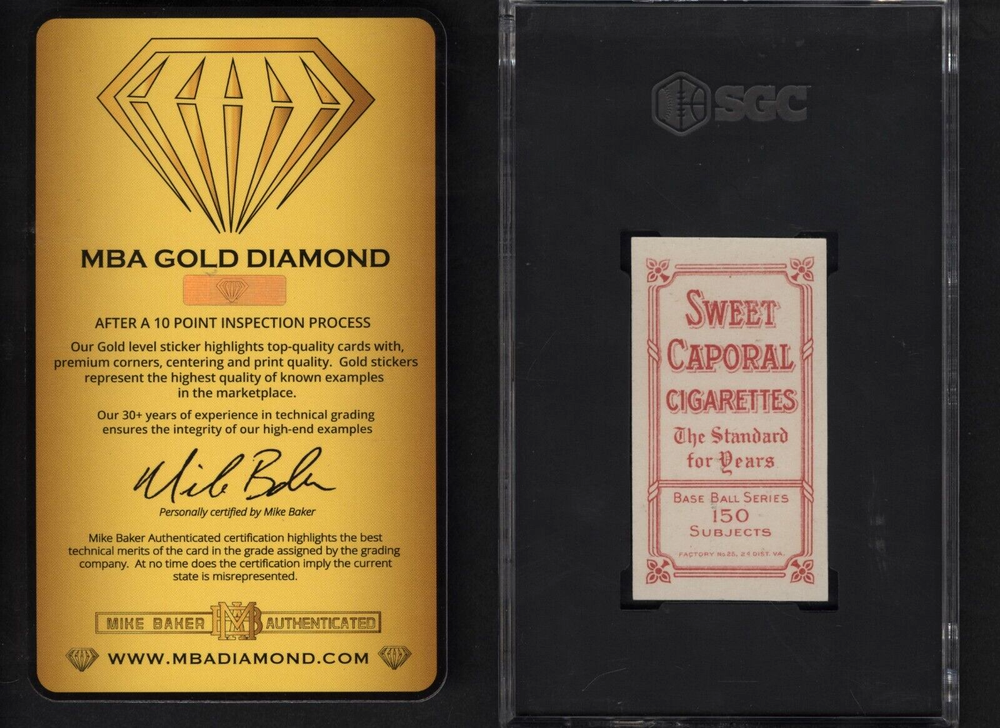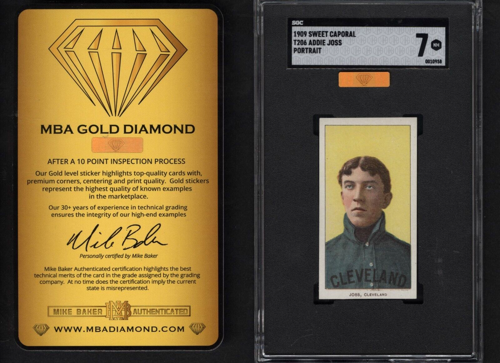1909 T206 Sweet Caporal ADDIE JOSS Portrait Cleveland Naps SGC NM 7+++ MBA GOLD Free shipping in USA only - International must be part of Ebay Global Shipping Program. Andy Madec Cards and Collectibles has been in business since 1994 selling Vintage and Rare Cards and other Memorabilia. Since the early 1990's, Andy Madec has been serving the needs of collectors and investors as a full service dealership. Offering an inventory of the finest sports cards and collectibles in the hobby, the company offer's outright purchases and/or liquidation on collections of all sizes. They have also made an incredible mark on the hobby by providing an attractive consignment service that gives people an opportunity to maximize on the value of their prized collection, when it's time to sell. Over the past 2 decades, Andy Madec has become known as one of the top dealers in the field of sports collectibles by partnering with collectors to assist them in building some of the hobby's most prized collections. Featured on numerous nationally syndicated radio talk shows including: Fox's "The Brick," ESPN Talk Radio, Bloomberg's Jerry Azar, Denver Clear Channel KOA's Mike Rosen, Ira Fistell of KABC radio in Los Angeles, The Rick Barry show on KNBR in San Francisco, Trader Speaks Collectors Hour, KABC-TV in Los Angeles, and many others. Andy Madec has also been profiled in such publications as: The San Francisco Chronicle, The Los Angeles Times and The New York Post. In 2006 Andy Madec was interviewed as an expert in his field by David Ellis of CNN Money.com and has appeared on ESPN "The Hot List" with Josh Elliott. Andy has appeared as an expert witness on "Judge Judy." Among the high grade cards and collectibles that Andy Madec has handled are those of Babe Ruth, Lou Gehrig, Ty Cobb, Honus Wagner, Joe DiMaggio, Mickey Mantle, Ted Williams, Sandy Koufax, Hank Aaron, Roberto Clemente, Knute Rockne, Johnny Unitas, Jim Brown, Bart Starr, Jim Thorpe, Bob Cousy, Bill Russell, Gordie Howe, Bobby Orr, Maurice Richard, and many others. Andy is also regarded as one of the hobby's leading experts on Vintage Photographs in both sports and non-sports subject matter. A former PSA Grader, Andy is considered one of the Hobby's foremost experts on sports card grading and authentication, as well as being a noted generalist in all facets of the sports collectibles market. Professional, knowledgeable, and confidential service is the foundation on which Andy Madec Sportscards was built. The goal Andy and his staff strive for is to provide the collector with a good experience while proudly maintaining the integrity of their solid reputation. This becomes obvious to anyone who does business with them.