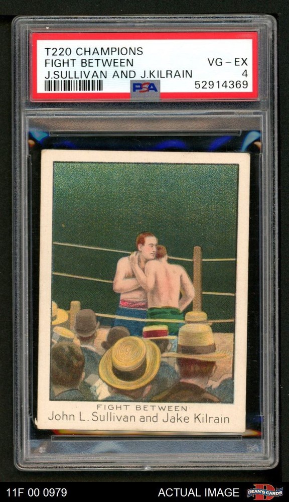 1910 T220 Champions White Border John L. Sullivan / Jake Kilrain PSA 4 - VG/EX If the scan in the listing says ACTUAL IMAGE, you will receive the card pictured. For cards issued after 1983, we will often use representative images and you will not receive the exact card pictured. Shipping Policy You only pay shipping on the first item. If you order multiple items on the same order, you will only be charged once for shipping. We do not combine shipping on multiple orders. To avoid multiple shipping charges we recommend using eBay's "Add to Cart" feature to check out multiple items in one transaction, or please request and allow for us to send an invoice to reflect the combined shipping charges. Canadian customers - We send all of our Canadian/International packages with tracking and cannot make any exceptions to this policy. Negotiating Prices All prices are final and we do not negotiate. This policy is to ensure that everyone knows that they are getting our best possible price. So please do not ask us to negotiate on price. Return Policy Dean's Cards has a 100% Money Back Satisfaction Guarantee on all purchases, as long as the product is returned within 30 days of receiving the product. Card Grading Each card is first reviewed by a member of our team, in order to detect any flaws that may not be visible on a scan, such as wrinkles, creases, print spots, or light stains. The vast majority of our vintage cards are professionally graded by the Dean's Cards Grading Software and include a 100% satisfaction guarantee. Our grading is on par with PSA standards when it comes to corners, centering and flaws - and tends to grade a bit tougher than PSA, on cards with a tilted image or rough edges. This grading software was developed to provide far better grading and consistency than can be achieved using the human eye. Determining the card's grade The sharpness of the corners and the degree to which a card was cut off-center determines the maximum possible grade that the card can receive. The card's grade is further reduced by any flaws or blemishes that it may have. Each card is evaluated on the following characteristics and assigned a score. Corners - Each corner of a card is individually analyzed, and then assigned a score on how square, sharp, and flawless it appears. Centering - The borders are measured, at multiple points along the edge, to determine the horizontal and vertical centering and tilt. Defects - The card is examined for imperfections, such as: size, print flaws, dings, stains, creases, or other wear which could lower its grade. Bonus for Perfect Centering - A vintage card, with near perfect centering, is given a one-half grade bonus. So when you buy one of our cards with a half-grade (e.g. 3.5 or 6.5) it will appear perfectly centered, both vertically and horizontally. Grading Criteria Worst Corner - A card can grade only as high as the worst corner will allow. Average Corner Tilt - The difference in width of a card border near the top, compared to the bottom. OCT - The sum of how far a card is Off-Center, plus its Tilt. Minimum Centering Requirements Eye Appeal - The combination of a card's centering, corners and tilt. Well-Centered - Cards that appear perfectly centered receive a bonus of one-half grade. Flaws, defects and other imperfections - can lower a card's grade. Card Backs - the above criteria is also considered, for the back of the cards, but does not inflict as severe of a penalty to its grade. Packaging Once scanned, the cards are placed in "soft" sleeves, which have an open top for easy removal. The Dean's Cards label is placed on the top back of the card sleeve. Every card you buy features a QR Code that you can scan to see your ACTUAL CARD and its grading statistics. Please note that when images are enlarged there may be instances of vertical lines running through the scans. This was caused by a "dust speck" on the scanner and can be verified by the vertical lines running into the black margins on the top and bottom of the image. About Dean and Dean's Cards Dean's Cards Makes Card Collecting - Fast, Easy And Fun. Dean's Cards was founded in 2002 and has become the leading online seller of vintage sports cards and non-sports cards. Our inventory has grown to more than a million vintage cards and we have a staff of 15-20 employees and a 8500 sq. ft. office space in Cincinnati, Ohio.