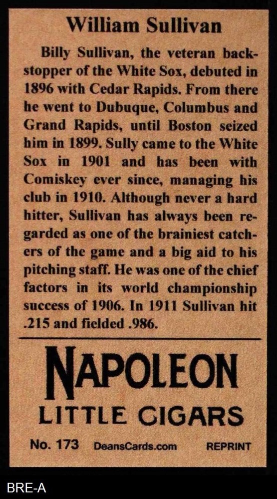 1912 T207 Reprint Billy Sullivan White Sox 8 - NM/MT ***PLEASE NOTE: IMAGES SHOWN FOR THIS LISTING ARE STOCK IMAGES. THE ITEM YOU RECEIVE WILL NOT BE THE EXACT ONE SHOWN.*** If you have any other questions, please contact us. Shipping Policy You only pay shipping on the first item only. If you order multiple items you will only be charged once for shipping per order. We do not combine shipping on multiple orders. To avoid multiple shipping charges we recommend using eBay's "Add to Cart" feature to check out multiple items in one transaction, or please request and allow for us to send an invoice to reflect the combined shipping charges. Canadian customers - please request an invoice or send message regarding shipping charges. ***Note: We send all of our Canadian/International packages with tracking. Return Policy Dean's Cards has a 100% Money Back Satisfaction Guarantee on all purchases, as long as the product is returned within 30 days of you receiving the product. About Dean and Dean's Cards Dean's Cards Makes Card Collecting - Fast, Easy And Fun. We have a scanned, online inventory of over 1,000,000 vintage cards. Dean's Cards was founded in 2002, and has become the leading online seller of vintage sports cards and non-sports cards. Our inventory has grown to more than a million vintage cards and we have a staff of 15-20 employees and a 8500 sq. ft. office space in Cincinnati, Ohio to offer you quick and personal service. Dean has written two books on collecting vintage baseball cards. Grading & Package Policy If the scan says ACTUAL IMAGE, you will receive the card pictured. For most cards 1980-present we use stock images and you will not receive the exact card pictured. Each card is professionally graded by a Dean's Cards expert and includes a 100% satisfaction guarantee. No one grades tougher than Dean's Cards and our grading is on par with PSA standards. The card was scanned before it was put into a sleeve, to clearly show any possible imperfections that the card may possess. In 2019, we launched a grading software that we use to evaluate the cards that we sell. While the software is used to grade most of our inventory, many cards are reviewed by human eyes to catch any flaws that the software may miss. This grading software was developed to provide far better grading and consistency than can be obtained using the human eye. For example, the scan sees the card at 1200 pixels per inch and a person with 20/20 vision sees it at about 338 ppi. One of the unique things about Dean's Cards Grading Standards is that we use "Half-Grades" to identify well-centered cards. Most of these cards appear perfectly centered to the human eye. For example, a card that grades 6.5 , will have all the corner characteristics and eye appeal of a card with a grade 6, and will also appear "perfectly centered", or close to it. Packaging The card is then placed in a standard "soft" sleeve, with an open top for easy removal. The Dean's Cards label is placed on the top back of the card sleeve, and is no way affixed to the surface of the card itself. Every card you buy features a QR Code that you can scan to see your ACTUAL CARD (not a representation) on your Smart Phone or Tablet. *Please note that when images are enlarged there may be instances of vertical lines running through the scans. This is a "dust speck" and it is evident by lines running into the black margins on the top and bottom of the image.* If you will give us the opportunity to earn your business, you will be glad that you did. We guarantee it! We love this hobby and work very hard to ensure that orders are shipped 100% correct, mailed within one business day and that the items sent are conservatively graded. Payment Policy Dean's Cards utilizes eBay's managed payments system. If you are experiencing difficulties making a payment, please contact eBay for assistance. All prices are final and we do not negotiate. This policy is to ensure that everyone is getting our best possible deal. So please do not ask us to negotiate on price.