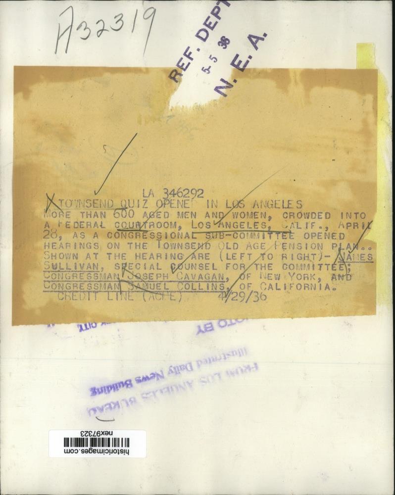 ebay template Note: Please study the images carefully to determine the condition of this vintage photograph, as it may not be in perfect condition. It may contain wrinkles, cracks, and possibly even tears due to its age and how it was handled before it got to us. A scanner may interpret colors and contrast differently than human eyes will, so it is possible that the actual photograph may be slightly darker or lighter in person. This vintage photograph is offered for sale as a collectible item and conveys no transfer of copyright. 1936 Press Photo Townsend Pension Plan Hearing J Sullivan J Cavagan S Collins This is an original press photo. More than 600 aged men and women, crowded into a federal courtroom, Los Angeles, California, as a congressional subcommittee opened hearings on the Townsend Old Age Pension Plan. Shown at the hearing are (left to right) James Sullivan, special counsel for the committee; Congressman Joseph Cavagan, of New York, and Congressman Samuel Collins, of California.Photo measures 9 x 7.25inches. Photo is dated 04-29-1936. PHOTO FRONT PHOTO BACK Historic Images Part Number: nex97323 FAQs Q: Can I just download a digital version instead? A: No, we sell only vintage originals and do not make or distribute any copies, including digital ones. Q: Do you combine shipping and invoices? A: Multiple photos won on the same seller ID combine automatically through the eBay checkout process. If you encounter problems with this, send us a message via eBay messaging and we will send you an invoice. Due to eBay limitations, we cannot combine items won on our different seller IDs for a single shipping charge. Q: How quickly do you ship the items once paid? A: We ship within one business day after your payment clears. If you do not receive an "order shipped" email from us by the close of the second business day from submitting payment, please e-mail us via eBay messaging. Q: How do you make sure my photograph arrives safely? A: We package each order between two cross-corrugated pieces of cardboard to ensure that the package is as difficult to bend as possible. We then wrap each order in a plastic sheet to help protect against moisture. We want you to rest assured that we take every precaution to ensure that the photograph you receive will be in the same condition in your care as it was in ours. Q: Will the "Historic Images" watermark be on my photo when I receive it? A: No. This is a digital watermark we use to protect our images. It is not printed on the photo. Q: What are your office hours? A: eBay for us is a business, and a very fun one to be in! We are open M-F 9 to 5 (CST). Therefore, we do not return e-mails and phone calls over the weekend. We observe the following holidays: New Years Day, Memorial Day, Fourth of July, Labor Day, Thanksgiving and the day after Thanksgiving, Christmas Eve and Christmas Day. Q: Where did all these vintage photos come from? A: These original vintage photographs are from various news service and newspaper photo archives from locations around the country including: Boston, Detroit, Tampa, Chicago, Denver, Seattle, New Orleans, Milwaukee, Portland, Spokane, and more. We do not copy or reproduce any photographs -- every item is a unique vintage piece that was housed in a news archive. Q: Can I use this photograph in my book/blog/website? A: The short answer is no. There is no transfer of copyright for republication or reproduction with these photographs when you purchase them, and only photographs taken before 1923 are currently automatically in the public domain. Permission from the copyright holder, which usually can be identified from the back of each photo, must be sought to republish or reproduce the image for any purpose. Q: Do you relist items (in case I miss an auction ending)? A: Auction items that receive no bids are relisted in our store (historicimages-store on eBay) as a fixed-price item and at a higher price than the starting auction price. Q: Do you leave feedback? A: Yes, we always leave feedback for buyers. Our software monitors when our buyers leave us feedback, then notifies us that we can leave feedback for the buyer. Rest assured, if you leave feedback, we will do the same! Check out our family of eBay IDs: historicimages01 Sports Photos historicimages02 Entertainment Photos historicimages03 Americana Photos historicimages04 International & War Photos historicimages05 Transportation Photos historicimages-store Our largest fixed-price selection historicimages-market Hand-picked photos and our New Orleans collection historicimages-gallery Hand-picked photos Saturday night auctions About Us Historic Images was formed in September 2009, with a handful of scanners working out of a basement to digitize newspaper photo archives. We have since moved out of the basement, and we can now archive thousands of photos per day. Our company has worked with magazines and newspapers from Detroit, Boston, Denver, Seattle, Tampa, Chicago, and New Orleans, just to name a few. We are constantly adding to our inventory, and have assembled an archive of millions of photos to date. As our company evolved, we began our eBay business, which brings thousands of fresh auctions per week to the world's largest online auction marketplace. Our custom software systems and team of great employees allow us to efficiently scan and sell large photo archives online. At the very core of our company's DNA is a strong commitment to customer satisfaction and strict integrity for our product. Our promise to you is that we will do everything in our power to provide you a great buying experience. Copyright 2009 - Present, Historic Images, Inc. Sell Smarter with Kyozou. Inventory and Ecommerce Management