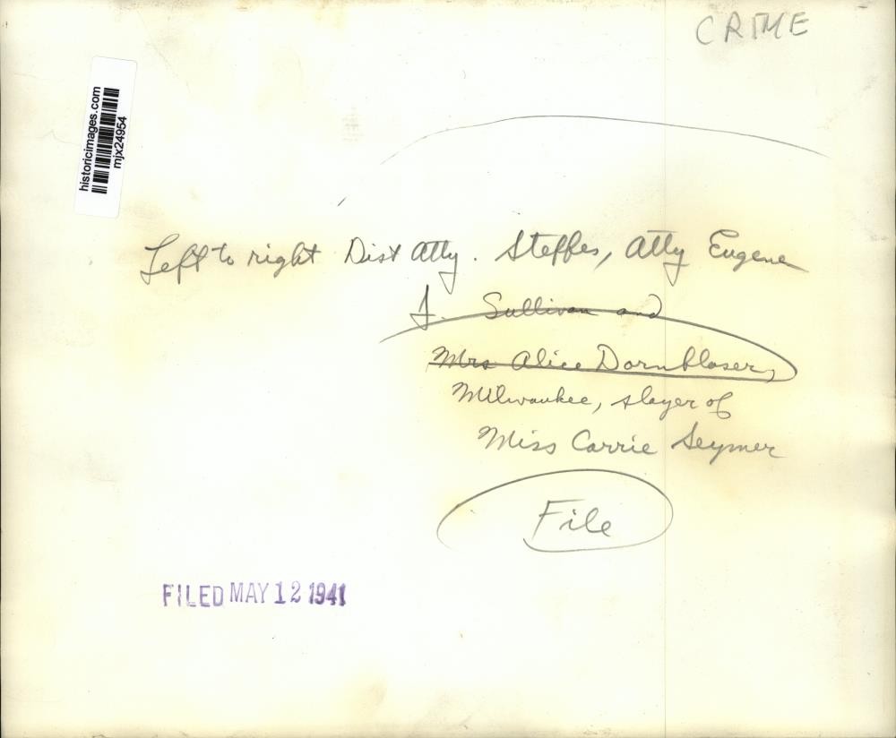 ebay template Note: Please study the images carefully to determine the condition of this vintage photograph, as it may not be in perfect condition. It may contain wrinkles, cracks, and possibly even tears due to its age and how it was handled before it got to us. A scanner may interpret colors and contrast differently than human eyes will, so it is possible that the actual photograph may be slightly darker or lighter in person. This vintage photograph is offered for sale as a collectible item and conveys no transfer of copyright. 1941 Press Photo Eugene F. Sullivan-Attorney With District Attorney and Other This is an original press photo. Left to right-District Attorney Steffe, Attorney Eugene F. Sullivan and Milwaukee, slayer of Miss Carrie Seymer.Photo measures 10 x 8.25inches. Photo is dated 05-12-1941. PHOTO FRONT PHOTO BACK Historic Images Part Number: mjx24954 Sell Smarter with Kyozou. Inventory and Ecommerce Management