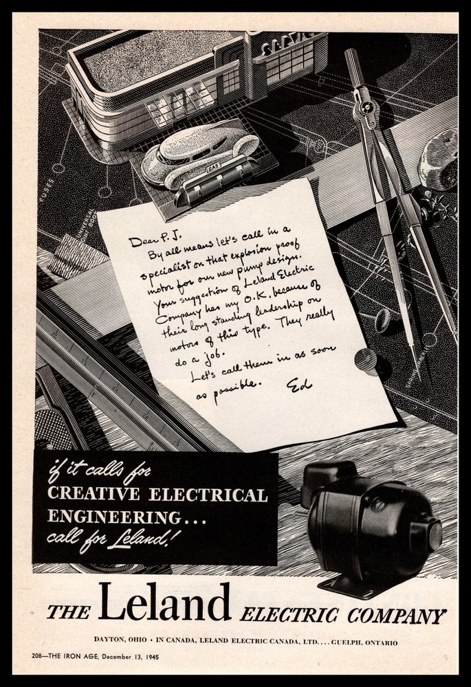 1945 The Leland Electric Company Dayton Ohio "Creative Engineering" Print Ad An Original (I only sell originals. No copies or reproductions.) Vintage Print Ad Magazine Paper Advertisement . Nice Historical Collector's piece. Each Page is approximately 8 x 11 inches and ready for framing should you choose to do so. Good Used Vintage Clean Condition. Normal shelf wear associated with use, age, and storage only. Please ZOOM in on the image for Detail to your own personal satisfaction. M essage me if you have any questions abou the listing. Thank you. === > Buy 4 or more items on the same order and the entire order ships FREE in the U.S. <=== Combined Shipping Policy: It's easy to purchase any additional items you want on the same order. Just ADD TO CART the items you want and they will be combined into one order to save you any further shipping costs. Meaning if you buy more than 1 item at a time on the same order, the shipping is FREE for the additional items. Also, if you buy 4 or more items on the same order your entire order ships FREE. Please use the ADD TO CART button to add to the Ebay shopping cart so that there is only one payment to keep things simple for everyone. Your ads will be packaged carefully in a Rigid Stayflat Stiff Non-Bendable Mailer and then placed inside a Waterproof Polybag for weather protection. I'm a U.S. based shipper and I ship the same day whenever possible. International Orders Outside The US: I ship internationally through the Ebay International Shipping program and always try to customize a listing if necessary in order to combine shipping when you order more than one item to save you money. Please message me via Ebay if you want to order more than one item and I will create a custom listing for you. International customers please contact Ebay Customer Support if you're having any issues during the check out process. Thank you. Features Details {{marketing_message_heading_1}} {{marketing_message_body_1}} {{marketing_message_heading_2}} {{marketing_message_body_2}} {{marketing_message_heading_3}} {{marketing_message_body_3}}