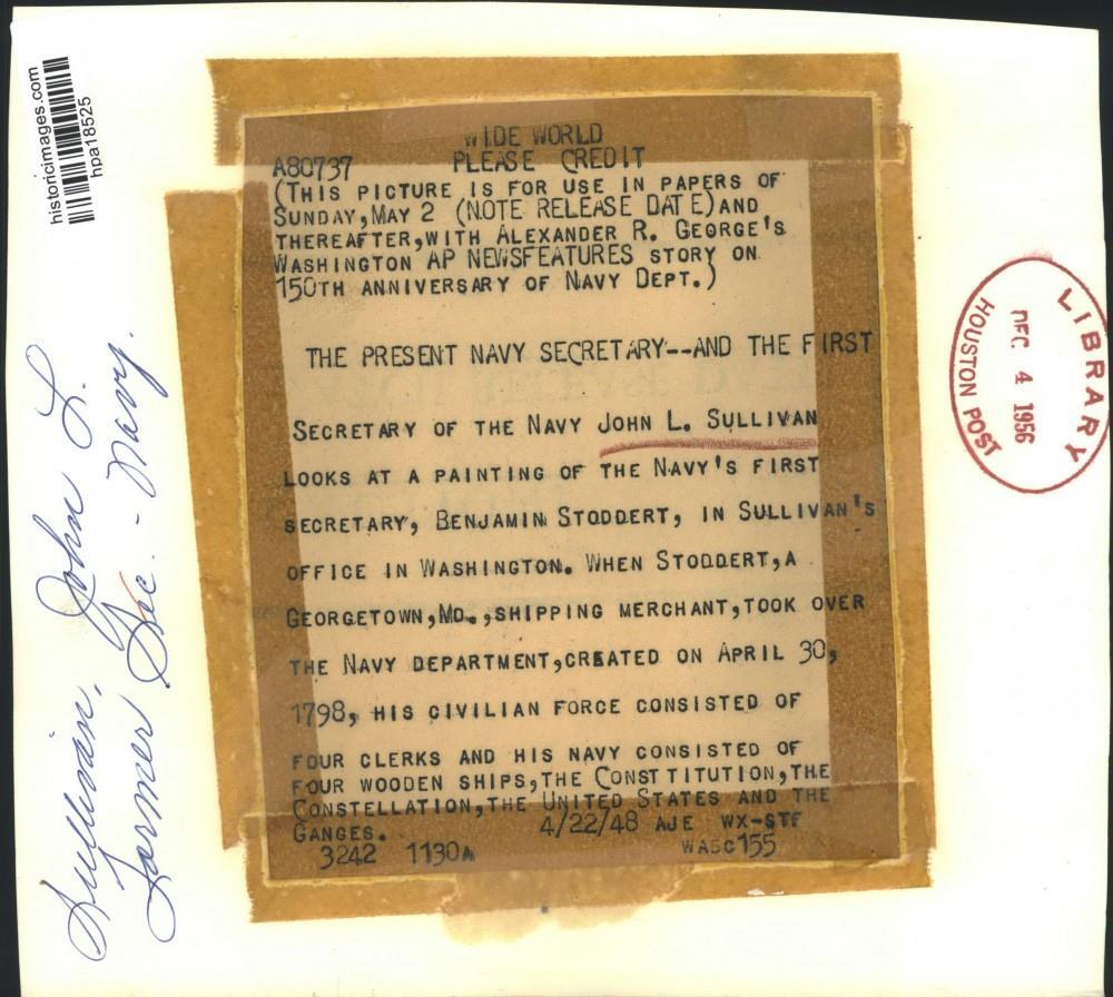 ebay template Note: Please study the images carefully to determine the condition of this vintage photograph, as it may not be in perfect condition. It may contain wrinkles, cracks, and possibly even tears due to its age and how it was handled before it got to us. A scanner may interpret colors and contrast differently than human eyes will, so it is possible that the actual photograph may be slightly darker or lighter in person. This vintage photograph is offered for sale as a collectible item and conveys no transfer of copyright. 1948 Press Photo Secretary of the Navy John L. Sullivan at Washington Office This is an original press photo. Sullivan, John L., Former Secretary - Navy - The present Navy Secretary - And the First Secretary of the Navy John L. Sullivan looks at a paintings of the Navy's first secretary, Benjamin Stoddert, in Sullivan's office in Washington. When Stoddert, a Georgetown, Maryland, shipping merchant, took over the Navy department, created on April 30, 1798, his civilian force consisted of four clerks and his navy consisted of four wooden ships, the Constitution, the Constellation, the United States and the Ganges.Photo measures 8 x 7.25inches. Photo is dated 04-22-1948. PHOTO FRONT PHOTO BACK Historic Images Part Number: hpa18525 FAQs Q: Can I just download a digital version instead? A: No, we sell only vintage originals and do not make or distribute any copies, including digital ones. Q: Do you combine shipping and invoices? A: Multiple photos won on the same seller ID combine automatically through the eBay checkout process. If you encounter problems with this, send us a message via eBay messaging and we will send you an invoice. Due to eBay limitations, we cannot combine items won on our different seller IDs for a single shipping charge. Q: How quickly do you ship the items once paid? A: We ship within one business day after your payment clears. If you do not receive an "order shipped" email from us by the close of the second business day from submitting payment, please e-mail us via eBay messaging. Q: How do you make sure my photograph arrives safely? A: We package each order between two cross-corrugated pieces of cardboard to ensure that the package is as difficult to bend as possible. We then wrap each order in a plastic sheet to help protect against moisture. We want you to rest assured that we take every precaution to ensure that the photograph you receive will be in the same condition in your care as it was in ours. Q: Will the "Historic Images" watermark be on my photo when I receive it? A: No. This is a digital watermark we use to protect our images. It is not printed on the photo. Q: What are your office hours? A: eBay for us is a business, and a very fun one to be in! We are open M-F 9 to 5 (CST). Therefore, we do not return e-mails and phone calls over the weekend. We observe the following holidays: New Years Day, Memorial Day, Fourth of July, Labor Day, Thanksgiving and the day after Thanksgiving, Christmas Eve and Christmas Day. Q: Where did all these vintage photos come from? A: These original vintage photographs are from various news service and newspaper photo archives from locations around the country including: Boston, Detroit, Tampa, Chicago, Denver, Seattle, New Orleans, Milwaukee, Portland, Spokane, and more. We do not copy or reproduce any photographs -- every item is a unique vintage piece that was housed in a news archive. Q: Can I use this photograph in my book/blog/website? A: The short answer is no. There is no transfer of copyright for republication or reproduction with these photographs when you purchase them, and only photographs taken before 1923 are currently automatically in the public domain. Permission from the copyright holder, which usually can be identified from the back of each photo, must be sought to republish or reproduce the image for any purpose. Q: Do you relist items (in case I miss an auction ending)? A: Auction items that receive no bids are relisted in our store (historicimages-store on eBay) as a fixed-price item and at a higher price than the starting auction price. Q: Do you leave feedback? A: Yes, we always leave feedback for buyers. Our software monitors when our buyers leave us feedback, then notifies us that we can leave feedback for the buyer. Rest assured, if you leave feedback, we will do the same! Check out our family of eBay IDs: historicimages01 Sports Photos historicimages02 Entertainment Photos historicimages03 Americana Photos historicimages04 International & War Photos historicimages05 Transportation Photos historicimages06 Photos of All Subjects historicimages07 Entertainment Photos historicimages08 Newsworthy Photos historicimages09 Entertainment Photos historicimages10 Sports Photos historicimages-store Our largest fixed-price selection historicimages-gallery Hand-picked photos Saturday night auctions About Us Historic Images was formed in September 2009, with a handful of scanners working out of a basement to digitize newspaper photo archives. We have since moved out of the basement, and we can now archive thousands of photos per day. Our company has worked with magazines and newspapers from Detroit, Boston, Denver, Seattle, Tampa, Chicago, and New Orleans, just to name a few. We are constantly adding to our inventory, and have assembled an archive of millions of photos to date. As our company evolved, we began our eBay business, which brings thousands of fresh auctions per week to the world's largest online auction marketplace. Our custom software systems and team of great employees allow us to efficiently scan and sell large photo archives online. At the very core of our company's DNA is a strong commitment to customer satisfaction and strict integrity for our product. Our promise to you is that we will do everything in our power to provide you a great buying experience. Copyright 2009 - Present, Historic Images, Inc. Sell Smarter with Kyozou. Inventory and Ecommerce Management