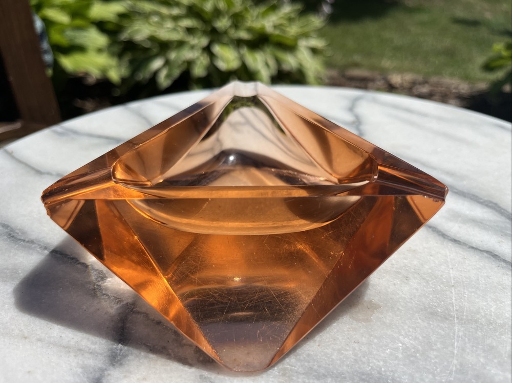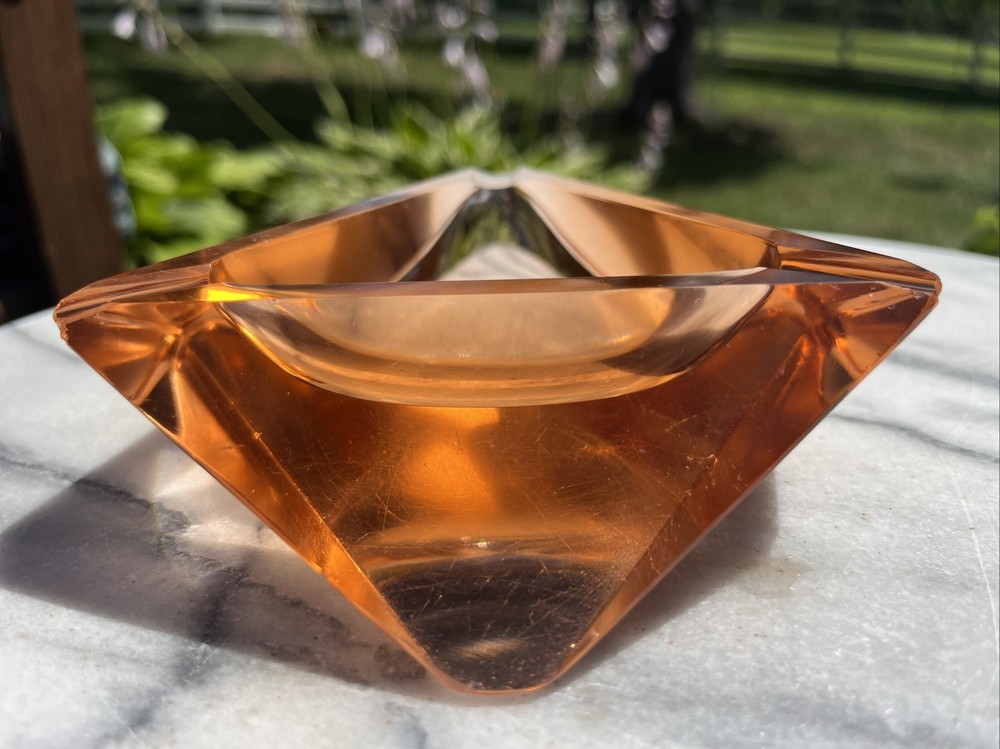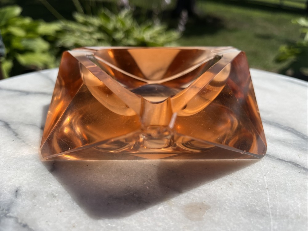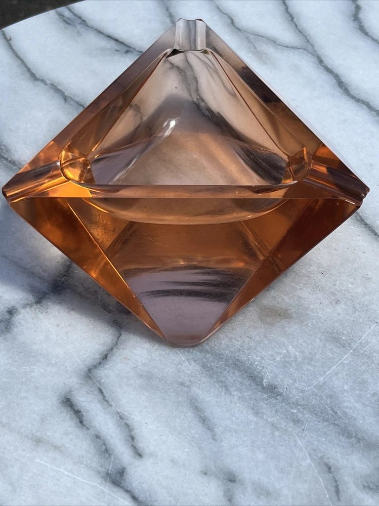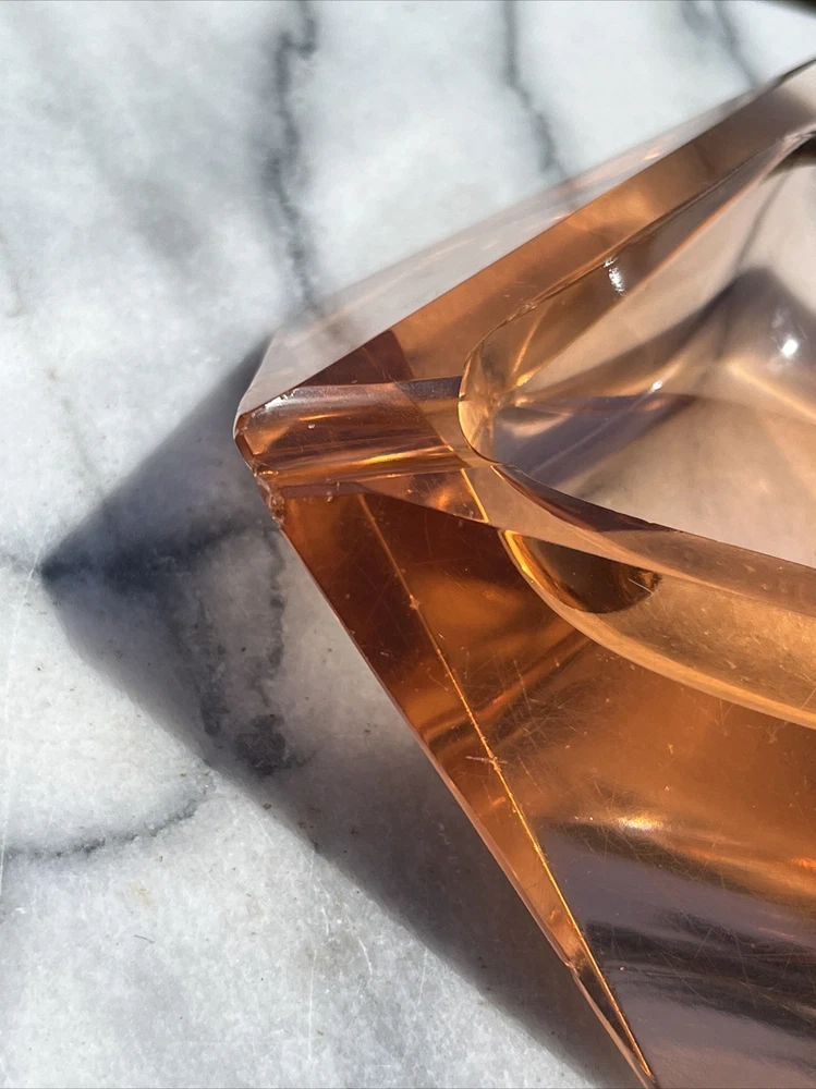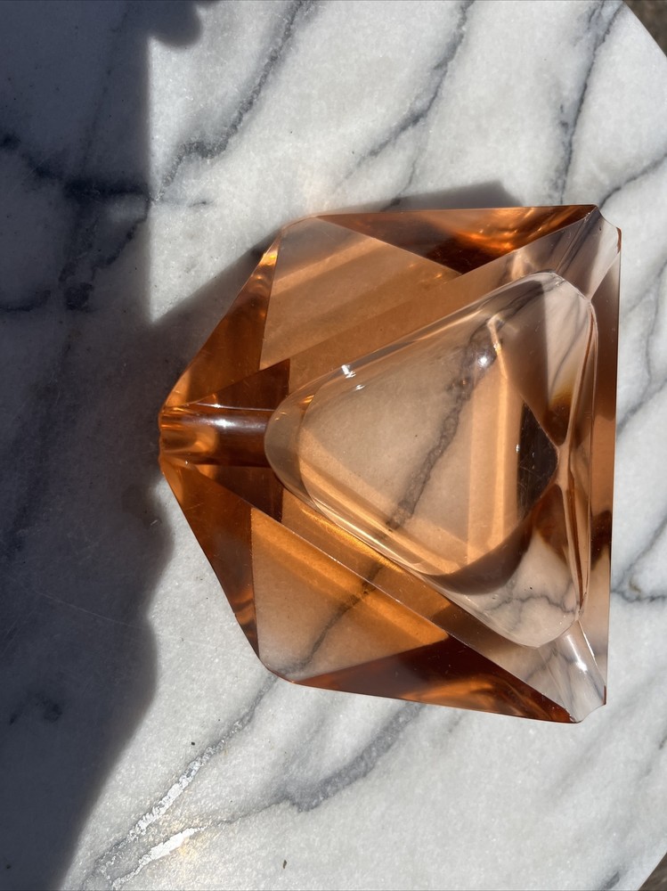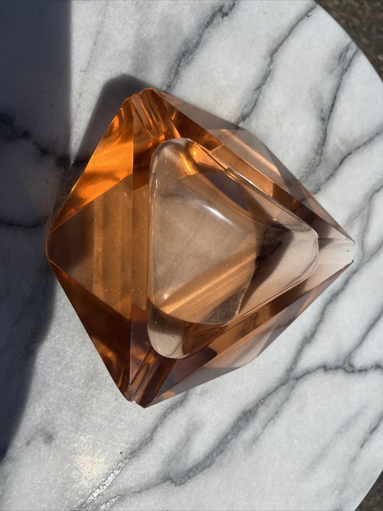 Beautiful 1950s Italian Crystal Ashtray Orange Pink. Possibly murano. Very cool mid century piece. About 5” wide and 2” tall...
