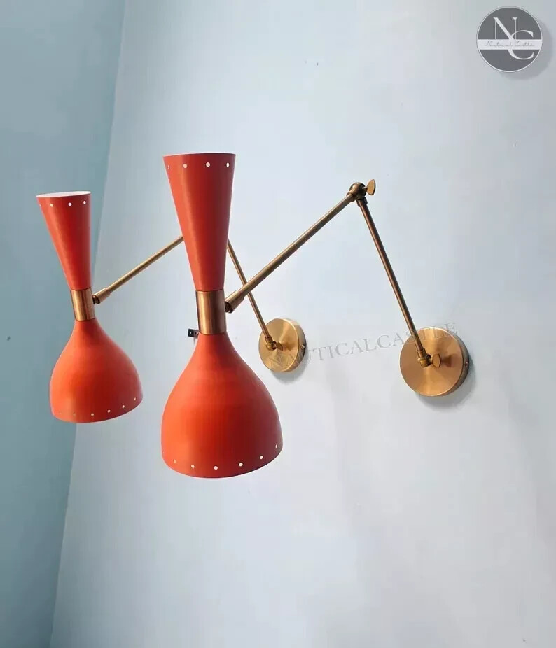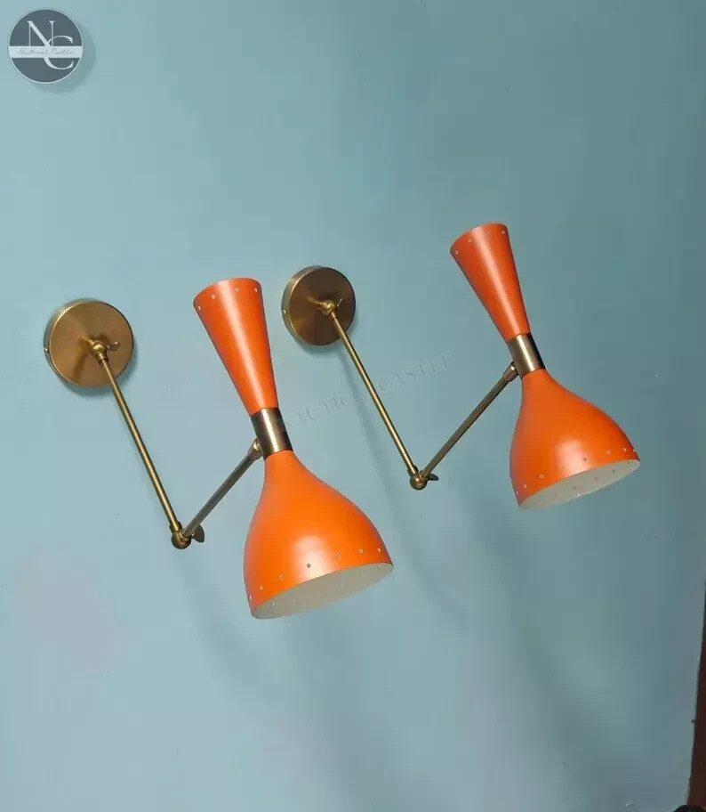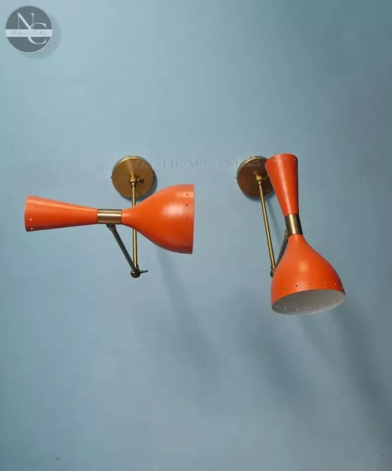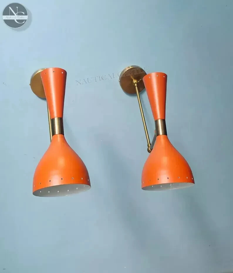 Width: 5 inches Height: 12 inches Depth: 8 inches Sconce Brass Wall Lamp Italian Diabolo Wall Scone Light Fixture Vintage lighting #PRODUCT SPECIFICATIONS: • Product: Wall Sconce • Material: Brass • Finish: Matte Finish (other brass finishes are available on request) • Color: Matte Orange • Measurements: W x 5'' inch D x 8'' inch H x 10.5 inch (Over Height With Canopy) • 1 Arms 2 Light wall fixture • Wall Fixture used standard candelabra E-12 and E-14 selected by you (light bulbs not included) • Set of two wall light lamps • Canopy 4''inch • All Components are UL approved. #BULB TYPE: • Requires Four (4) 15 watt bulb type A (not included) • E-12 Or E-14 socket Rated with 125 voltage, 75 watt max. • 7 watt to 15 watt bulbs are recommended. • Incandescent Bulbs, Energy Saying, LED Bulbs. #PRODUCT DETAILS: *It has 1 arms/2 lights and measures 11.5 without light bulbs. It uses standard candelabra socket light bulbs. *We recommend 15W to 40W max. Light bulbs are not included. Ceiling canopy can be adjustable at different angles so you can hang this chandelier from slopped ceiling. *We hand craft all of our light fixtures. This chandelier has been made with brass material. *Minor variations in finish are an inherent characteristic of such material and add to the beauty and uniqueness of the product.