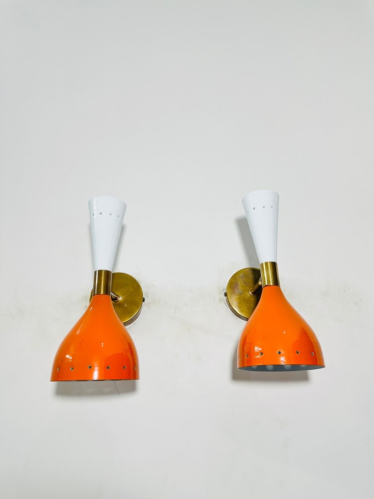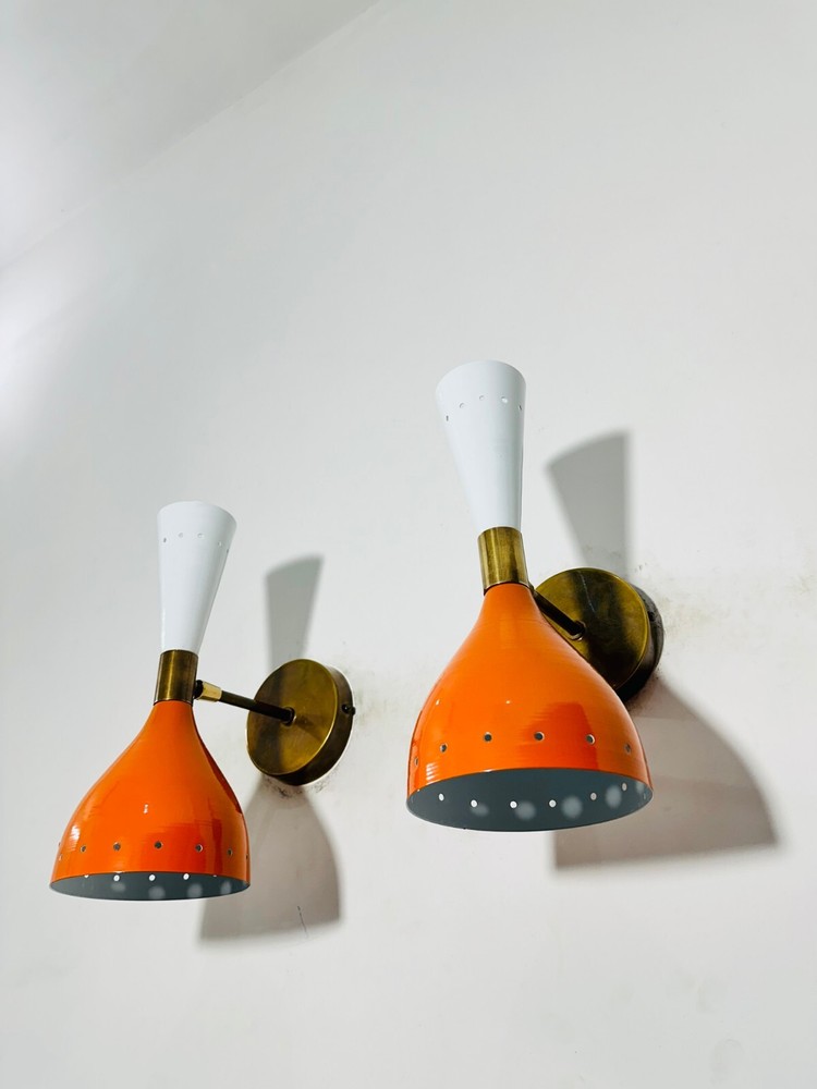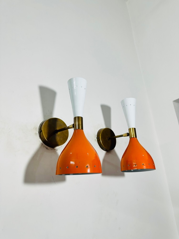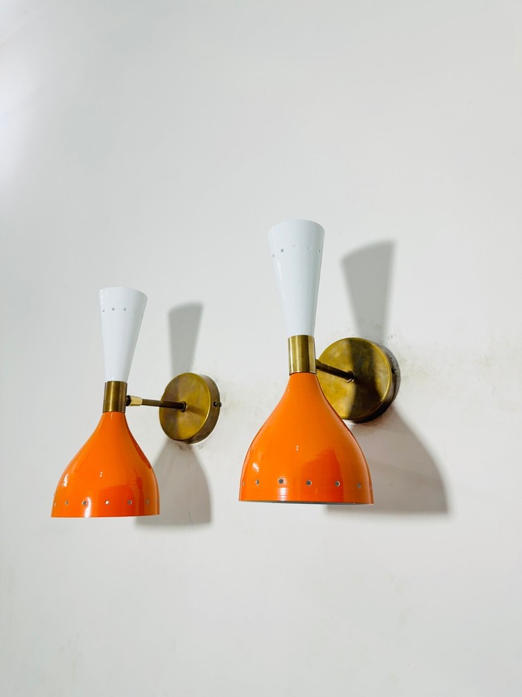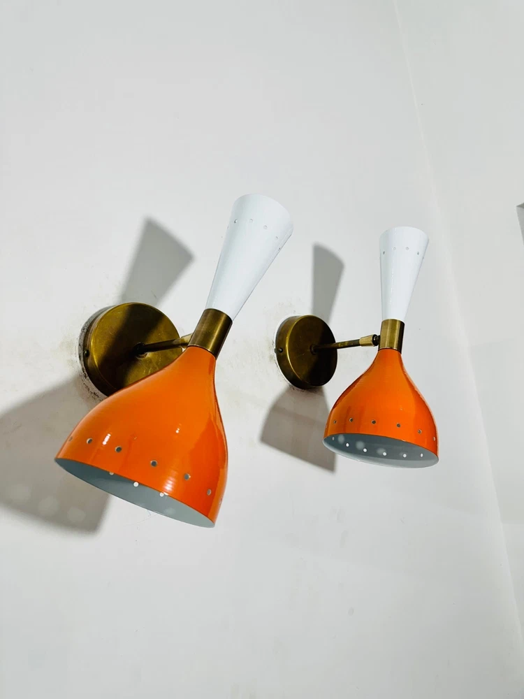 1950s Mid Century Brass Italian Diabolo Wall Sconce Light Fixture 2 Bulb Pair. PRODUCT DETAILS:- Product: Wall Sconce Material: Metal , Brass Size: 10.5" x 5" x 8" Inches Canopy: 4" Inches Wall Sconce Diabolo Pair of Two Modern Italian Wall Lights White Wall Fixture Light . This is Stilnovo Style light fixture is made with UL approved parts. It has 1 arms/lights and measures 5" in diameter without light bulbs. It uses standard sconce socket light bulbs. We recommend 15W to 40W max. Light bulbs are not included. Wall canopy can be adjustable at different angles so you can mount this sconce. We hand craft all of our light fixtures. This chandelier has been made with brass material. Minor variations in finish are an inherent characteristic of such material and add to the beauty and uniqueness of the product. PRODUCT SPECIFICATIONS: • Premium quality mid-century Wall Fixture. • Made of pure brass brass shiny finish . other brass finishes are available at request. • Measurements is :L x 10.5 inch B x 5'' inch H x 8'' inch Wall canopy To Light Socket Edge • Set of Two Diabolo Wall Fixture • Orange and White (see video for actual color) • Wall Fixture used standard sconce E-12 or E-14 light bulbs. (not included) • Canopy 4''inch • Reproduction Production Not Sold Antique. MATERIALS: • Brass, Metal • All Components are UL approved. BULB TYPE: • Requires Four (4) 15 watt bulb type A (not included). • E-12 or E-14 socket Rated with 125 voltage, 75 watt max. • 7 watt to 15 watt bulbs are recommended. • Incandescent Bulbs, Energy Saying, LED Bulbs.