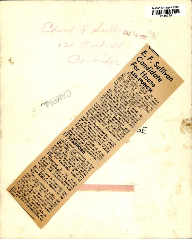 ebay template Note: Please study the images carefully to determine the condition of this vintage photograph, as it may not be in perfect condition. It may contain wrinkles, cracks, and possibly even tears due to its age and how it was handled before it got to us. A scanner may interpret colors and contrast differently than human eyes will, so it is possible that the actual photograph may be slightly darker or lighter in person. This vintage photograph is offered for sale as a collectible item and conveys no transfer of copyright. 1952 Press Photo House Candidate E. F. Sullivan - lra46734 This is an original press photo. Edward F. Sullivan, 12 Reed st., Cambridge, today announced his candidacy for Democratic nomination as representative in 10, and 11 of Cambridge and Precincts 1 and 2 of Watertown. His statement is as follows: "My experience in public life has been varied: I served as clerk in the street department, paymaster in the city treasury, clerk of committee office, clerk of the cemetery commission and veterans benefits agent."Photo measures 8.25 x 10inches. Photo is dated 08-14-1952. PHOTO FRONT PHOTO BACK Historic Images Part Number: lra46734 FAQs Q: Can I just download a digital version instead? A: No, we sell only vintage originals and do not make or distribute any copies, including digital ones. Q: Do you combine shipping and invoices? A: Multiple photos won on the same seller ID combine automatically through the eBay checkout process. If you encounter problems with this, send us a message via eBay messaging and we will send you an invoice. Due to eBay limitations, we cannot combine items won on our different seller IDs for a single shipping charge. Q: How quickly do you ship the items once paid? A: We ship within one business day after your payment clears. If you do not receive an "order shipped" email from us by the close of the second business day from submitting payment, please e-mail us via eBay messaging. Q: How do you make sure my photograph arrives safely? A: We package each order between two cross-corrugated pieces of cardboard to ensure that the package is as difficult to bend as possible. We then wrap each order in a plastic sheet to help protect against moisture. We want you to rest assured that we take every precaution to ensure that the photograph you receive will be in the same condition in your care as it was in ours. Q: Will the "Historic Images" watermark be on my photo when I receive it? A: No. This is a digital watermark we use to protect our images. It is not printed on the photo. Q: What are your office hours? A: eBay for us is a business, and a very fun one to be in! We are open M-F 9 to 5 (CST). Therefore, we do not return e-mails and phone calls over the weekend. We observe the following holidays: New Years Day, Memorial Day, Fourth of July, Labor Day, Thanksgiving and the day after Thanksgiving, Christmas Eve and Christmas Day. Q: Where did all these vintage photos come from? A: These original vintage photographs are from various news service and newspaper photo archives from locations around the country including: Boston, Detroit, Tampa, Chicago, Denver, Seattle, New Orleans, Milwaukee, Portland, Spokane, and more. We do not copy or reproduce any photographs -- every item is a unique vintage piece that was housed in a news archive. Q: Can I use this photograph in my book/blog/website? A: The short answer is no. There is no transfer of copyright for republication or reproduction with these photographs when you purchase them, and only photographs taken before 1923 are currently automatically in the public domain. Permission from the copyright holder, which usually can be identified from the back of each photo, must be sought to republish or reproduce the image for any purpose. Q: Do you relist items (in case I miss an auction ending)? A: Auction items that receive no bids are relisted in our store (historicimages-store on eBay) as a fixed-price item and at a higher price than the starting auction price. Q: Do you leave feedback? A: Yes, we always leave feedback for buyers. Our software monitors when our buyers leave us feedback, then notifies us that we can leave feedback for the buyer. Rest assured, if you leave feedback, we will do the same! Check out our family of eBay IDs: historicimages01 Sports Photos historicimages02 Entertainment Photos historicimages03 Americana Photos historicimages04 International & War Photos historicimages05 Transportation Photos historicimages06 Photos of All Subjects historicimages07 Entertainment Photos historicimages08 Newsworthy Photos historicimages09 Entertainment Photos historicimages10 Sports Photos historicimages-store Our largest fixed-price selection historicimages-gallery Hand-picked photos Saturday night auctions About Us Historic Images was formed in September 2009, with a handful of scanners working out of a basement to digitize newspaper photo archives. We have since moved out of the basement, and we can now archive thousands of photos per day. Our company has worked with magazines and newspapers from Detroit, Boston, Denver, Seattle, Tampa, Chicago, and New Orleans, just to name a few. We are constantly adding to our inventory, and have assembled an archive of millions of photos to date. As our company evolved, we began our eBay business, which brings thousands of fresh auctions per week to the world's largest online auction marketplace. Our custom software systems and team of great employees allow us to efficiently scan and sell large photo archives online. At the very core of our company's DNA is a strong commitment to customer satisfaction and strict integrity for our product. Our promise to you is that we will do everything in our power to provide you a great buying experience. Copyright 2009 - Present, Historic Images, Inc. Sell Smarter with Kyozou. Inventory and Ecommerce Management