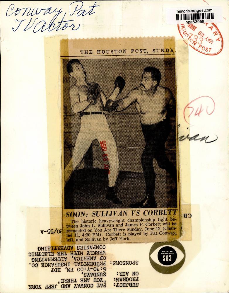 ebay template Note: Please study the images carefully to determine the condition of this vintage photograph, as it may not be in perfect condition. It may contain wrinkles, cracks, and possibly even tears due to its age and how it was handled before it got to us. A scanner may interpret colors and contrast differently than human eyes will, so it is possible that the actual photograph may be slightly darker or lighter in person. This vintage photograph is offered for sale as a collectible item and conveys no transfer of copyright. 1955 Press Photo John L. Sullivan vs. James F. Corbett fight on CBS-TV. This is an original press photo. Pat Conway and Jeff York "You Are There," Sundays, 6:30-7:00 PM, EDT, sponsored by: Prudential Insurance Company of America, alternating weekly with the Electric Companies advertising. Soon: Sullivan vs. Corbett: The historic heavyweight championship fight between John L. Sullivan and James F. Corbett will be re-enacted on "You Are There," Sunday, June 12 (Channel 11, 4:30 PM). Corbett is played by Pat Conway, left, and Sullivan by Jeff York. Photo measures 7 x 9inches. Photo is dated 05-29-1955. PHOTO FRONT PHOTO BACK Historic Images Part Number: hpa83958 FAQs Q: Can I just download a digital version instead? A: No, we sell only vintage originals and do not make or distribute any copies, including digital ones. Q: Do you combine shipping and invoices? A: Multiple photos won on the same seller ID combine automatically through the eBay checkout process. If you encounter problems with this, send us a message via eBay messaging and we will send you an invoice. Due to eBay limitations, we cannot combine items won on our different seller IDs for a single shipping charge. Q: How quickly do you ship the items once paid? A: We ship within one business day after your payment clears. If you do not receive an "order shipped" email from us by the close of the second business day from submitting payment, please e-mail us via eBay messaging. Q: How do you make sure my photograph arrives safely? A: We package each order between two cross-corrugated pieces of cardboard to ensure that the package is as difficult to bend as possible. We then wrap each order in a plastic sheet to help protect against moisture. We want you to rest assured that we take every precaution to ensure that the photograph you receive will be in the same condition in your care as it was in ours. Q: Will the "Historic Images" watermark be on my photo when I receive it? A: No. This is a digital watermark we use to protect our images. It is not printed on the photo. Q: What are your office hours? A: eBay for us is a business, and a very fun one to be in! We are open M-F 9 to 5 (CST). Therefore, we do not return e-mails and phone calls over the weekend. We observe the following holidays: New Years Day, Memorial Day, Fourth of July, Labor Day, Thanksgiving and the day after Thanksgiving, Christmas Eve and Christmas Day. Q: Where did all these vintage photos come from? A: These original vintage photographs are from various news service and newspaper photo archives from locations around the country including: Boston, Detroit, Tampa, Chicago, Denver, Seattle, New Orleans, Milwaukee, Portland, Spokane, and more. We do not copy or reproduce any photographs -- every item is a unique vintage piece that was housed in a news archive. Q: Can I use this photograph in my book/blog/website? A: The short answer is no. There is no transfer of copyright for republication or reproduction with these photographs when you purchase them, and only photographs taken before 1923 are currently automatically in the public domain. Permission from the copyright holder, which usually can be identified from the back of each photo, must be sought to republish or reproduce the image for any purpose. Q: Do you relist items (in case I miss an auction ending)? A: Auction items that receive no bids are relisted in our store (historicimages-store on eBay) as a fixed-price item and at a higher price than the starting auction price. Q: Do you leave feedback? A: Yes, we always leave feedback for buyers. Our software monitors when our buyers leave us feedback, then notifies us that we can leave feedback for the buyer. Rest assured, if you leave feedback, we will do the same! Check out our family of eBay IDs: historicimages01 Sports Photos historicimages02 Entertainment Photos historicimages03 Americana Photos historicimages04 International & War Photos historicimages05 Transportation Photos historicimages-store Our largest fixed-price selection historicimages-market Hand-picked photos and our New Orleans collection historicimages-gallery Hand-picked photos Saturday night auctions About Us Historic Images was formed in September 2009, with a handful of scanners working out of a basement to digitize newspaper photo archives. We have since moved out of the basement, and we can now archive thousands of photos per day. Our company has worked with magazines and newspapers from Detroit, Boston, Denver, Seattle, Tampa, Chicago, and New Orleans, just to name a few. We are constantly adding to our inventory, and have assembled an archive of millions of photos to date. As our company evolved, we began our eBay business, which brings thousands of fresh auctions per week to the world's largest online auction marketplace. Our custom software systems and team of great employees allow us to efficiently scan and sell large photo archives online. At the very core of our company's DNA is a strong commitment to customer satisfaction and strict integrity for our product. Our promise to you is that we will do everything in our power to provide you a great buying experience. Copyright 2009 - Present, Historic Images, Inc. Sell Smarter with Kyozou. Inventory and Ecommerce Management
