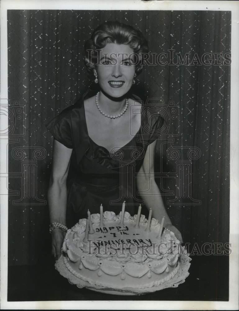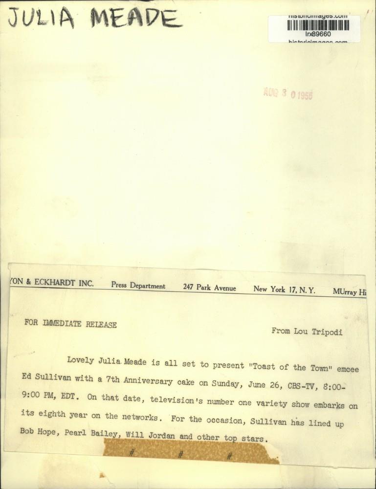 ebay template Note: Please study the images carefully to determine the condition of this vintage photograph, as it may not be in perfect condition. It may contain wrinkles, cracks, and possibly even tears due to its age and how it was handled before it got to us. A scanner may interpret colors and contrast differently than human eyes will, so it is possible that the actual photograph may be slightly darker or lighter in person. This vintage photograph is offered for sale as a collectible item and conveys no transfer of copyright. 1955 Press Photo Julia Meade presents 7th Anniversary cake for emcee Ed Sullivan This is an original press photo. Lovely Julia Meade is all set to present "Toast of the Town" emcee Ed Sullivan with a 7th Anniversary cake on Sunday, June 26, CBS-TV, 8:00-9:00 PM, EDT. On that date, television's number one variety show embarks on its eighth year on the networks. For the occasion, Sullivan has lined up Bob Hope, Pearl Bailey, Will Jordan and other top stars. Photo measures 7 x 9.25inches. Photo is dated 06-26-1955. PHOTO FRONT PHOTO BACK Historic Images Part Number: lrx89660 Sell Smarter with Kyozou. Inventory and Ecommerce Management