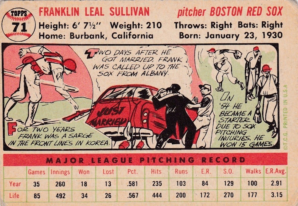 This week I'm offering a number of old baseball cards for sale. Here I have a very nice card from the 1956 Topps set, #71 Frank Sullivan of the Boston Red Sox. See scans for condition. Not bad for a card that's nearly sixty years old! This would be a terrific addition to any collection! Payment is via PayPal; shipping is $2.75 for First Class Mail, and postage will be combined for multiple winnings. Powered by SixBit's eCommerce Solution