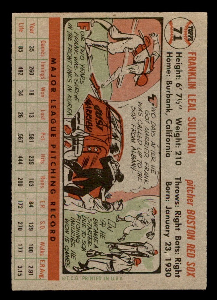 1956 Topps Baseball #71 Frank Sullivan VG/EX *k1 Description Attached is a high resolution scan. Shipping Terms Upon receipt of payment, items will typically ship within 1-2 business days. If multiple items are purchased together, shipping will be automatically combined at checkout. FAQ - Cards that are graded VG/EX or lower may have wrinkles or creases. If you have a specific question regarding a card's condition, please ask. - In the title, you may see notations such as "*e1, *d2, etc", these do not refer to the card grade, but are internal inventory designators. About Us BBC Emporium is always aggressively buying sports cards from 1975 and older. We travel the entire country and always offer competitive pricing. Contact us for a quote on your collection.