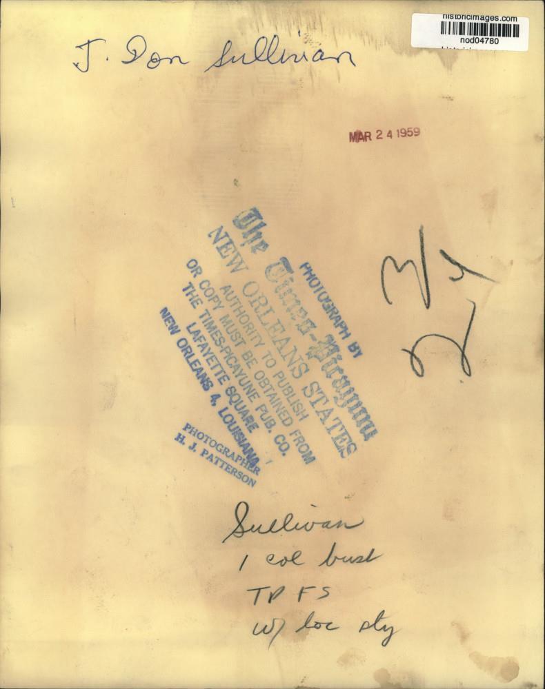 ebay template Note: Please study the images carefully to determine the condition of this vintage photograph, as it may not be in perfect condition. It may contain wrinkles, cracks, and possibly even tears due to its age and how it was handled before it got to us. A scanner may interpret colors and contrast differently than human eyes will, so it is possible that the actual photograph may be slightly darker or lighter in person. This vintage photograph is offered for sale as a collectible item and conveys no transfer of copyright. 1959 Press Photo J. Don Sullivan - nod04780 This is an original press photo. J. Don SullivanPhoto measures 8 x 10.25inches. Photo is dated 03-24-1959. PHOTO FRONT PHOTO BACK Historic Images Part Number: nod04780 Sell Smarter with Kyozou. Inventory and Ecommerce Management
