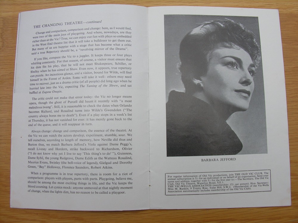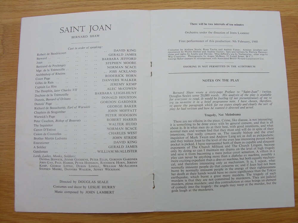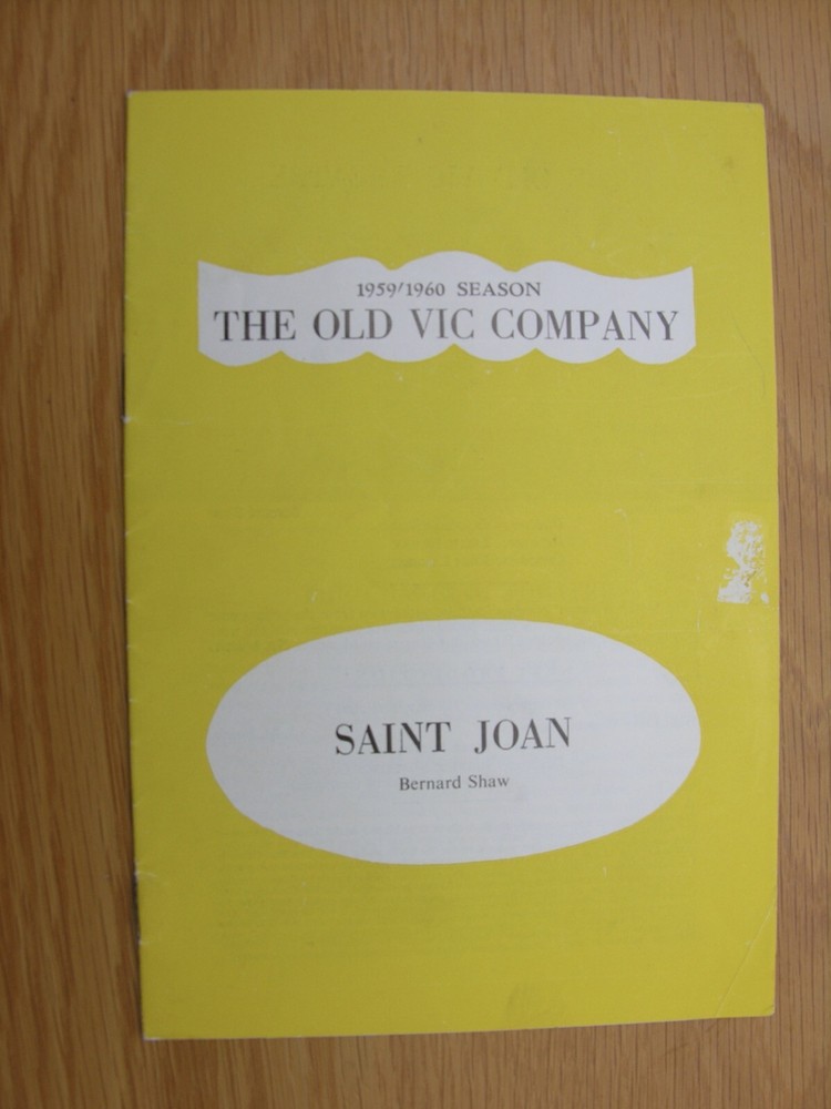 1959 SAINT JOAN Bernard Shaw Barbara Jefford, Joss Ackland, Alec McCowen Old Vic Programme for Saint Joan by Bernard Shaw at the Old Vic, 1959 Director : Douglas Seale Featuring : Barbara Jefford, Joss Ackland, Alec McCowen, David King, Gerald James, Stephen Moore, Norman Scace, Roderick Horn, Danvers Walker, Jeremy Kemp, Barbara Leigh-Hunt, Donald Houston, Gordon Gardner, George Baker, John Moffatt, Peter Hodgson, Robert Harris, Walter Hudd, Charles West, John Stride, William McCallister The programme measures 18.5 x 12.5cm and has 12 pages C ondition : The programme is in good second-hand vintage condition, showing reading wear and creasing, some minor damage to the covers where the sealing sticker was removed - visible in the pictures below. The programme pictured is the one you will receive. I accept returns, and if you would like any further information - just ask ! Theatre Box - DR-30-F _gsrx_vers_1677 (GS 9.8.1 (1677))