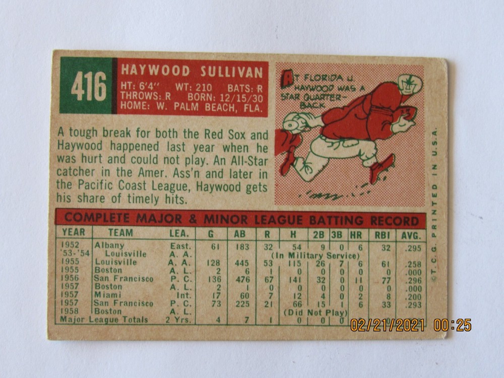 <div style="text-align:center"><img src="http://ti2.auctiva.com/sw/java.gif" border="0"><br><table align="center"><tr><td><a style="text-decoration:none" href="http://emporium.auctiva.com/ajoy70" target="_blank"><img src="http://ti2.auctiva.com/sw/images.gif" border="0"></a></td><td height="27px" valign="middle" align="center"><font face="arial" size="2"><b><a href="http://emporium.auctiva.com/ajoy70" target="_blank">ajoy70</a> Store</b></font></td></tr></table></div> <img src="http://ti2.auctiva.com/web/aswCredit.gif" border="0"><br><a href="http://www.auctiva.com/?how=scLnk2" target="_blank"><img src="http://ti2.auctiva.com/images/sc1line2.gif" border="0"></a> Thank you for taking the time to view my auction. Please take time to view all my auctions of vintage sports cards, and collectibles. I have numerous HOFers at great prices listed this week! You are bidding on a 1959 TOPPS #416 HAYWOOD SULLIVAN card . See high res scans. In my best judgment this card is in EX condition. Let your eyes be the final judge. All payments are due within 3 business days of auction end. PayPal is the only accepted method of payment. My schedule only permits going to the post office twice weekly (Wednesday and Saturday). S&H is 2.95 for U.S. Postal Service 1st Class Mail - with Delivery Confirmation secure with a bubble mailer or cardboard box. I will combine shipping for multiple winning bids. Positive feedback will be left upon successful receipt of payment. I value my feedback, so if you have any issues with your order, please let me know and I will correct it if possible. Thank you for the opportunity to earn your business. Good luck bidding! <div style="text-align:center"><a style="text-decoration:none" href="http://mostpopular.sellathon.com/?id=AC1347010"><img src="http://www.sellathon.com/Resources/Images/countercredit.gif" border="0"></a></div>