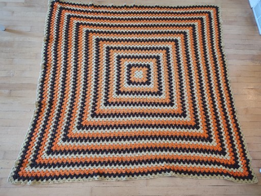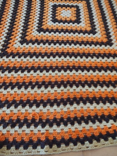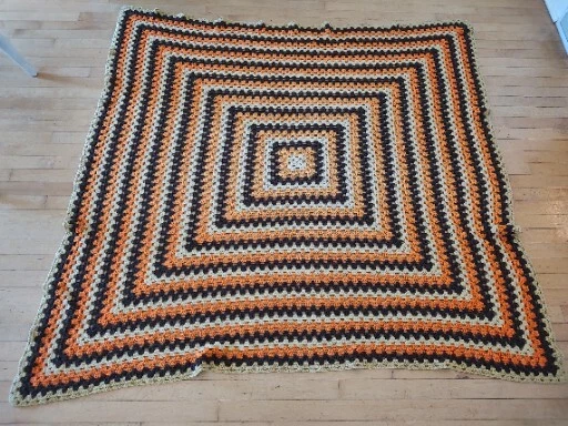 Add a pop of retro charm to your home decor with this stunning 1960's 1970's Mid Century Modern Crochet Throw. Measuring 6'x6' and made from high-quality material, this multicolor throw features a beautiful square shape and a double-sided design. Whether you're curling up on the sofa or snuggling up in bed, this throw is sure to keep you warm and cozy. The throw is pre-owned but has been well cared for and is in excellent condition. The vibrant orange, brown, and yellow colors are perfect for adding a touch of nostalgia and warmth to any room in your home. Handmade in the United States, this throw is a one-of-a-kind piece that will be treasured for years to come.