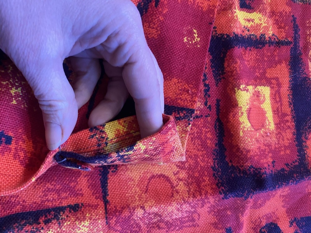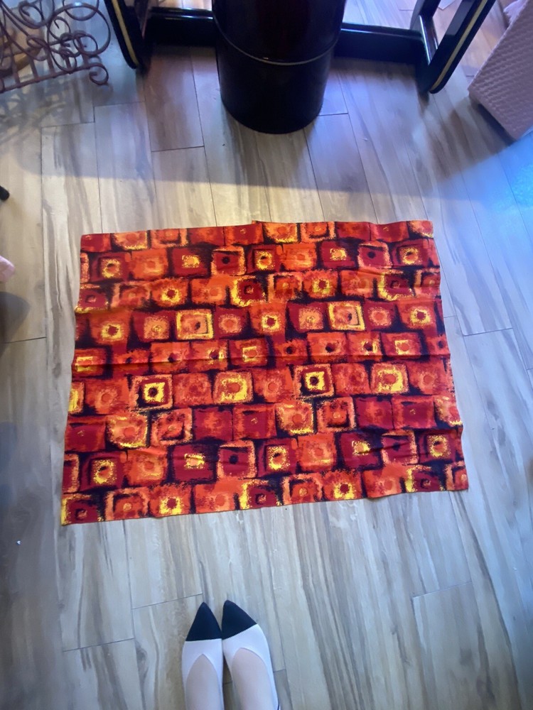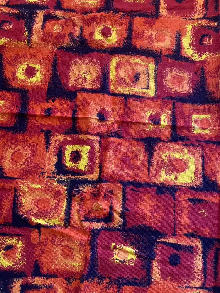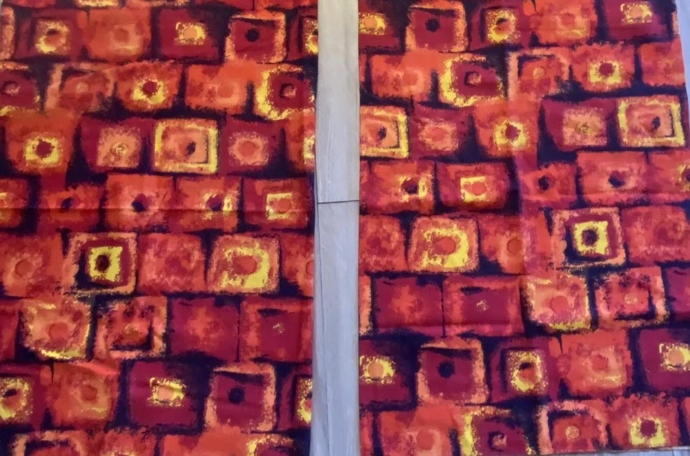 Great pair of likely handmade curtains in quintessential 70’s colours of red, yellow and orange. These are a shorter set of curtains probably made for a rec room or bedroom In excellent condition Each panel measures 40 inches by 30 inches