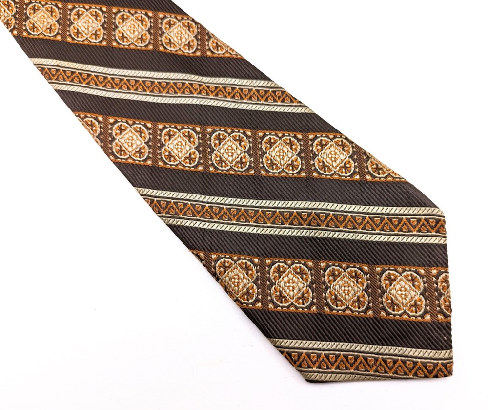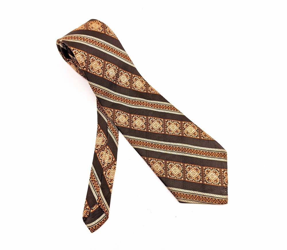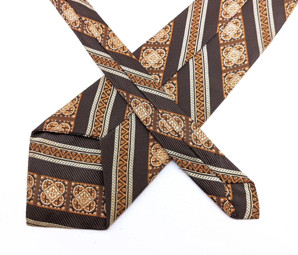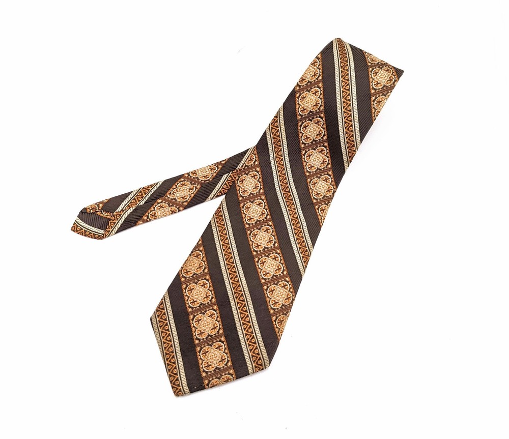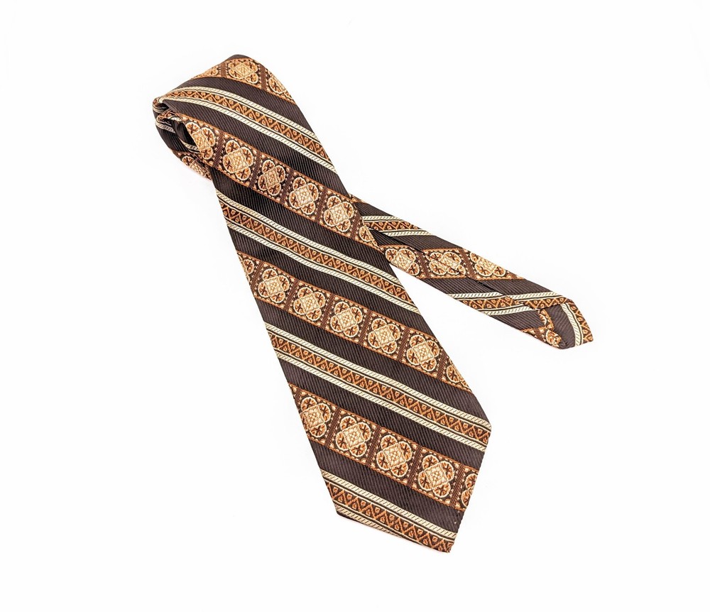1960s-70s Mod Brown & Orange Tie Mad Men Era Mid Century Modern Men's Vintage Polyester Necktie Super Mod 1960s to early 70s Vintage Men's Brown & Orange Woven Polyester Necktie. Looks fantastic with Mad Men Era Suits! Nice shiny fabric with woven texture and diagonal bands throughout! This tie is unlabeled, still a very nice tie with great colors! Vintage: 1960s-70s Maker/Label: No Maker Label Material: not labeled but feels like a Polyester or Polyester Blend Length Tip to Tip: 52-1/2" Width at Widest Point: 3-3/4" Width at Narrowest Point: 7/8" Condition: Very Good [Item #NM4708] ------------------------------------------------------------------------------------------------ The Fine Print: In the spirit of recycling and reusing, we offer only authentic vintage items. Please expect normal wear from age/use. Your happiness is important to us so we will carefully endeavor to describe any damage an item may have and also include several photographs of each item offered. Please be certain to look over all photos and carefully read item descriptions before making a purchase as we do not offer refunds or exchanges on vintage items unless we have grossly misrepresented an item or overlooked major damage. All of our ties are shipped rolled, not folded, in a sturdy cardboard box with plastic liner to protect from the elements. The shipping cost includes both delivery confirmation and insurance. We ship by USPS First Class Mail for both domestic and international customers. Our items are ready to ship in 1-3 business days and often ship the day of purchase. Estimated delivery time for U.S. customers is 5-7 business days. International customers are responsible for any and all customs fees, duty, VAT and taxes imposed by their government on incoming international shipments. International shipping times can occasionally vary from the US Postal Service time estimates due to the handling time of the customs officials in the buyer's country. Thanks for looking and happy hunting from TIE1ON!