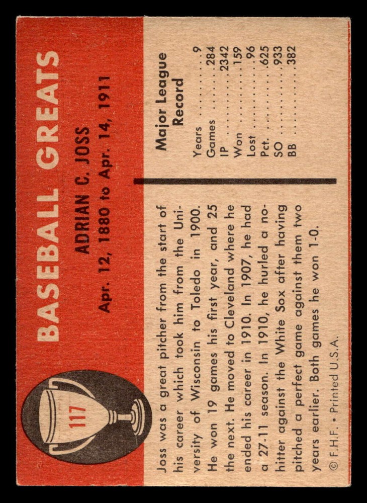 If you have any questions about this item please contact me. We have been an Authorized PSA Dealer since 1996! We stand behind our products. Buy with confidence. Thank You - Brian Marcy, Owner - Scottsdale Baseball Cards 462897 1961 Fleer #117 Addie Joss Excellent+ Indians Original/Licensed Reprint: Original Player/Athlete: Addie Joss Team: Cleveland Indians Season: 1961 Year Manufactured: 1961 Vintage: Yes Card Number: #117 Sport: Baseball Manufacturer: Fleer Set: 1961 Fleer Graded: No Card Condition: Excellent+ Professional Grader: Not Professionally Graded Features: Base Set Answers to commonly asked questions: Q: Do you combine shipping? A: Yes, please request an invoice, and we will gladly combine shipping charges. Q: Does the card have a crease? A: Generally, cards we grade as VG or lower will have creases. Please send us a message on any card you have questions about and we will pull the card from inventory and inspect it closer for you! If you would like to be assured your card will be crease-free please buy cards that are EX or better condition. Payment is due within 3 days after the auction closes. This listing created with GLETech Multiple Selling Channel tools.