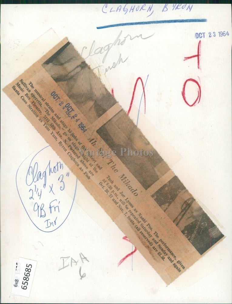 1964 Photo Byron Claghorn Musical Stage Gilbert Sullivan Operetta Mikado 6X8 Photo Front Photo Back We are selling the original press photos which have been sitting in drawers, folders and boxes at newspapers' offices for decades. All of our photos are in used condition and none have been officially rated. The best indication of condition is the scans you see on the listing which are scans of the individual photo being sold and not a stock image. Please study the images carefully to determine the condition of this vintage photograph, as it may not be in perfect condition. It may contain wrinkles, cracks, and possibly even tears due to its age and how it was handled before it got to us. This vintage photograph is offered for sale as a collectible item and conveys no transfer of copyright. Frequently Asked Questions Q: Can I just download a digital version instead? A: No, we sell only vintage originals and do not make or distribute any copies, including digital ones. Q: Do you combine shipping and invoices? A: Multiple photos won on the same seller ID combine automatically through the eBay checkout process. If you encounter problems with this, send us a message via eBay messaging and we will send you an invoice. Due to eBay limitations, we cannot combine items won on our different seller IDs for a single shipping charge. Q: How quickly do you ship the items once paid? A: We ship within one business day after your payment clears. Q: How do you make sure my photograph arrives safely? A: We package each order between two cross-corrugated pieces of cardboard to ensure that the package is as difficult to bend as possible. We then send each order in a plastic envelope to help protect against moisture. We want you to rest assured that we take every precaution to ensure that the photograph you receive will be in the same condition in your care as it was in ours. Q: Will the "Vintage Image Photos" watermark be on my photo when I receive it? A: No, t he watermark is digitally added to prevent online image theft. It is not on the actual photo. Q: What are your office hours? A: eBay for us is a business, and a very fun one to be in! We are open M-F 9 to 5 (CST). Therefore, we do not return e-mails and phone calls over the weekend. We observe the following holidays: New Year’s Day, President’s Day, Memorial Day, Fourth of July, Labor Day, Columbus Day, Thanksgiving, Christmas Day. Q: Where did all these vintage photos come from? A: These original vintage photographs are from various news service and newspaper photo archives from locations around the country including: Boston, Detroit, Tampa, Chicago, Denver, Seattle, New Orleans, Milwaukee, Portland, Spokane, Miami and more. We do not copy or reproduce any photographs -- every item is a unique vintage piece that was housed in a news archive. Q: Can I use this photograph in my book/blog/website? A: Our official answer to copyright questions is: “This vintage photograph is offered for sale as a collectible item and conveys no transfer of copyright.” Copyright laws are fairly complex. Some, but not all of our photos copyrights have expired into the public domain. These works have expired into the public domain: -All works published in the U.S. before 1923 -All works published with a copyright notice from 1923 through 1963 without copyright renewal -All works published without a copyright notice from 1923 through 1977 -All works published without a copyright notice from 1978 through March 1, 1989, and without subsequent registration within 5 years. Since we don’t know which of these rules apply to each photo, you can contact the newspaper that originally published the photograph (if it’s still in business) to obtain copyright permission if you are wanting to reproduce it. . Q: Do you relist items (in case I miss an auction ending)? A: Auction items that receive no bids are relisted in our store as a fixed-price item and at a higher price than the starting auction price. Q: Do you leave feedback? A: Yes, we always leave feedback for buyers. Our software monitors when our buyers leave us feedback, then notifies us that we can leave feedback for the buyer. Rest assured, if you leave feedback, we will do the same! About Us Vintage Image Photos was formed in December 2010, with a single scanner working out of a home office to digitize newspaper photo archives. We can now archive hundreds of photos per day, which allows us to bring thousands of fresh auctions per week to the world's largest online auction marketplace. We are constantly adding to our inventory, and have assembled an archive of hundreds of thousands of photos to date. We have photos from newspapers from Cleveland, Detroit, Boston, Denver, Seattle, Tampa, St. Petersburg, Chicago, Miami and New Orleans. Satisfaction Guarantee We want to make sure your every transaction you have with Vintage Image Photos is a great buying experience. We do our best to describe and show each item accurately. The pictures in the listing are scans of the actual photo, not a stock image, so you know exactly what to expect. We use tracking for every shipment and respond within one business day to all messages and requests. If, for any reason, you’re not satisfied with a photo, we offer a 60 day return window, the longest one available on eBay. Powered by SixBit's eCommerce Solution