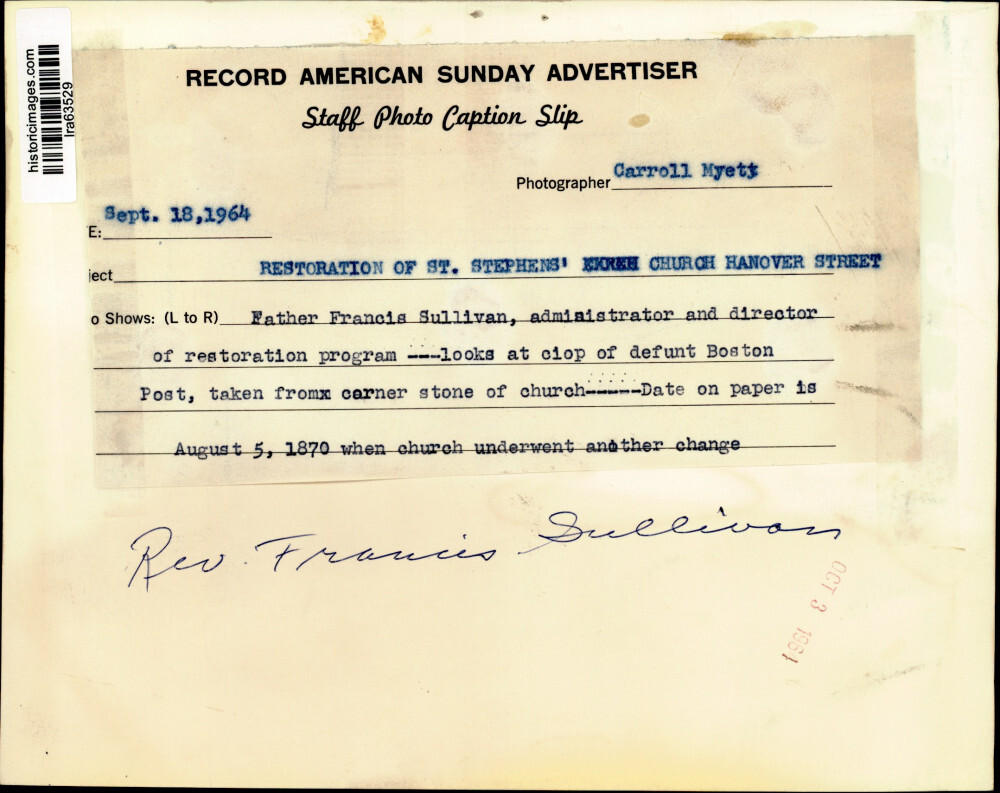 ebay template Note: Please study the images carefully to determine the condition of this vintage photograph, as it may not be in perfect condition. It may contain wrinkles, cracks, and possibly even tears due to its age and how it was handled before it got to us. A scanner may interpret colors and contrast differently than human eyes will, so it is possible that the actual photograph may be slightly darker or lighter in person. This vintage photograph is offered for sale as a collectible item and conveys no transfer of copyright. 1964 Press Photo Francis Sullivan examines Boston Post taken from cornerstone This is an original press photo. Restoration of St. Stephens' Church, Hanover Street. Father Francis Sullivan, administrator and director of restoration program, looks at ciop of defunt Boston Post, taken from corner stone of church, date on paper is August 5, 1870 when church underwent another change. Photo measures 9 x 7inches. Photo is dated 9-18-1964. PHOTO FRONT PHOTO BACK Historic Images Part Number: lra63529 Sell Smarter with Kyozou. Inventory and Ecommerce Management