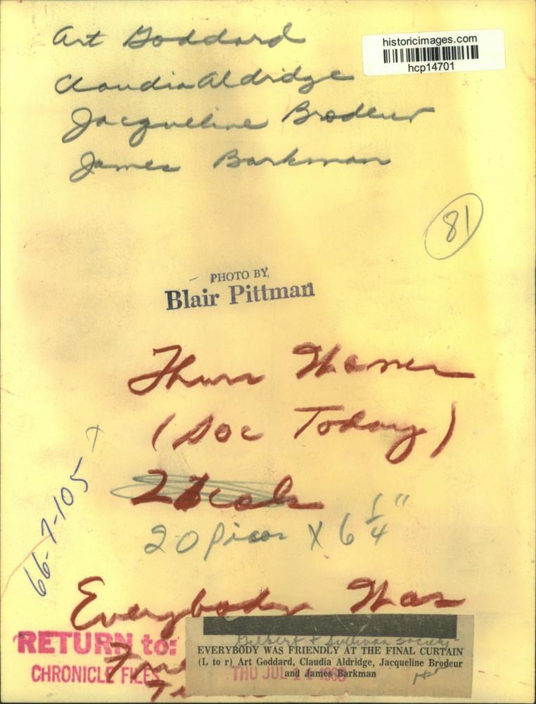 ebay template Note: Please study the images carefully to determine the condition of this vintage photograph, as it may not be in perfect condition. It may contain wrinkles, cracks, and possibly even tears due to its age and how it was handled before it got to us. A scanner may interpret colors and contrast differently than human eyes will, so it is possible that the actual photograph may be slightly darker or lighter in person. This vintage photograph is offered for sale as a collectible item and conveys no transfer of copyright. 1966 Press Photo Gilbert & Sullivan Society Actors at Final Curtain - hcp14701 This is an original press photo. Gilbert & Sullivan Society Actors at Final Curtain. (L to R) Art Goddard, Claudia Aldridge, Jacqueline Brodeur and James BarkmanPhoto measures 6.5 x 8.5inches. Photo is dated 07-11-1966. PHOTO FRONT PHOTO BACK Historic Images Part Number: hcp14701 Sell Smarter with Kyozou. Inventory and Ecommerce Management