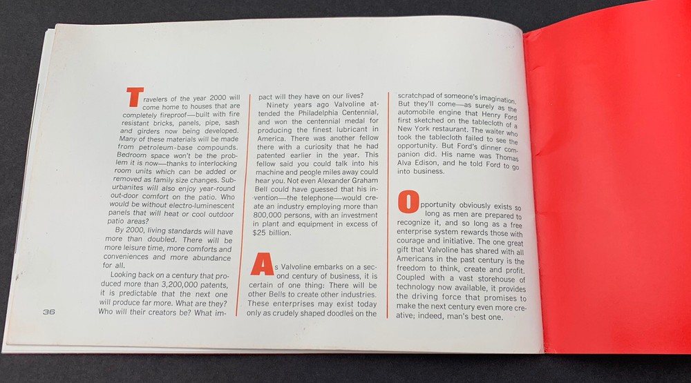 VALVOLINE WORLD 100 YEARS 1866 - 1966 Man's Most Creative Century - A 100th Birthday Story ORIGINAL NOT A REPRINT! Does have soiling and signs of wear study the photos. 36 page color booklet Copyright 1966, Valvoline Oil Company, a division of Ashland Oil & Refining Company, Ashland, KY 9" x 6" ~~~~~~~~~~~~~~~~~~~~ Be sure to visit my other auctions! Shipping/Handling costs will be calculated by destination. I ship most items Priority Mail within 24 hours of receiving payment. Yes Priority is the expensive way but items are rarely lost or broken and they include tracking and up to $100 in insurance. Priority mail provides the boxes therefore you are not charged a fee for purchasing a box. I can't control what the post office or shipping company charges. They set the rates. Items weigh what they weigh. Items shipped from 98119. Proper packaging is expensive should I need to add in for that I only cover my cost of materials. Payment must be received within 7 days of the close of the auction.