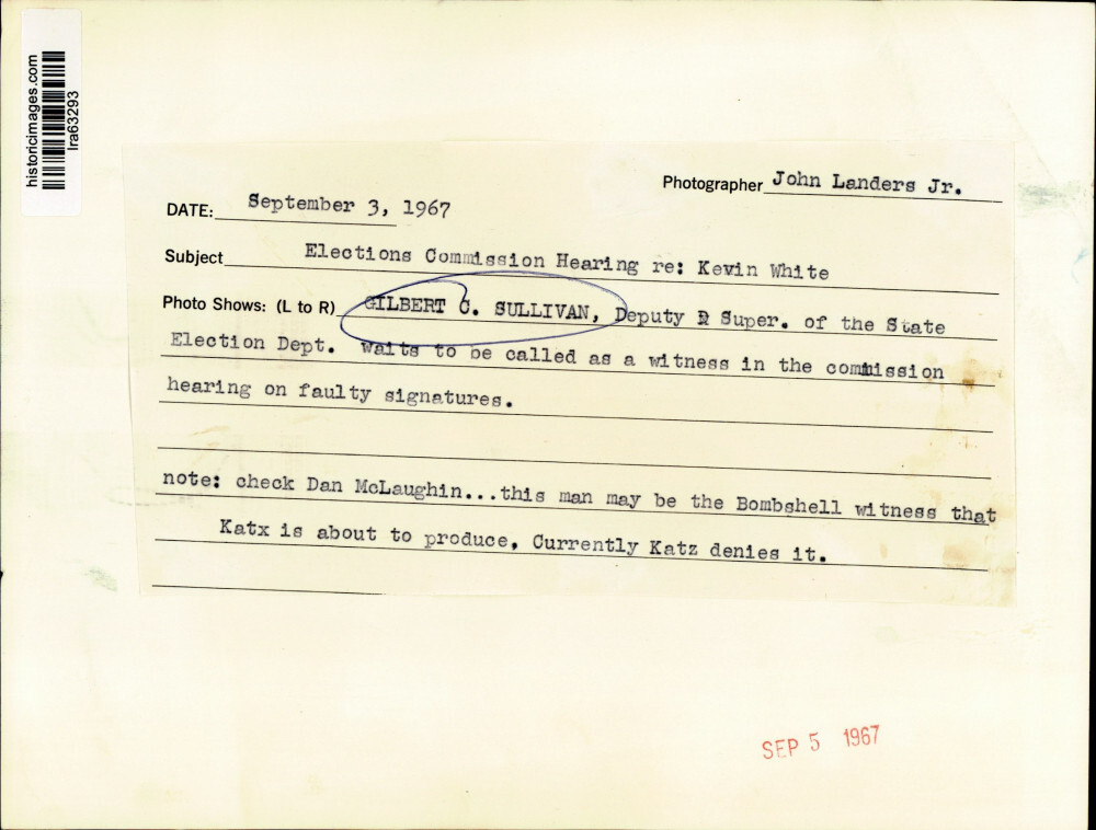ebay template Note: Please study the images carefully to determine the condition of this vintage photograph, as it may not be in perfect condition. It may contain wrinkles, cracks, and possibly even tears due to its age and how it was handled before it got to us. A scanner may interpret colors and contrast differently than human eyes will, so it is possible that the actual photograph may be slightly darker or lighter in person. This vintage photograph is offered for sale as a collectible item and conveys no transfer of copyright. 1967 Press Photo Gilbert Sullivan, Superintendent of State Election Department This is an original press photo. Elections Commission Hearing re: Kevin White - Gilbert C. Sullivan, Deputy Superintendent of the State Election Department, waits to be called as a witness in the commission hearing on faulty signatures.Photo measures 7 x 9.25inches. Photo is dated 9-3-1967. PHOTO FRONT PHOTO BACK Historic Images Part Number: lra63293 FAQs Q: Can I just download a digital version instead? A: No, we sell only vintage originals and do not make or distribute any copies, including digital ones. Q: Do you combine shipping and invoices? A: Multiple photos won on the same seller ID combine automatically through the eBay checkout process. If you encounter problems with this, send us a message via eBay messaging and we will send you an invoice. Due to eBay limitations, we cannot combine items won on our different seller IDs for a single shipping charge. Q: How quickly do you ship the items once paid? A: We ship within one business day after your payment clears. If you do not receive an "order shipped" email from us by the close of the second business day from submitting payment, please e-mail us via eBay messaging. Q: How do you make sure my photograph arrives safely? A: We package each order between two cross-corrugated pieces of cardboard to ensure that the package is as difficult to bend as possible. We then wrap each order in a plastic sheet to help protect against moisture. We want you to rest assured that we take every precaution to ensure that the photograph you receive will be in the same condition in your care as it was in ours. Q: Will the "Historic Images" watermark be on my photo when I receive it? A: No. This is a digital watermark we use to protect our images. It is not printed on the photo. Q: What are your office hours? A: eBay for us is a business, and a very fun one to be in! We are open M-F 9 to 5 (CST). Therefore, we do not return e-mails and phone calls over the weekend. We observe the following holidays: New Years Day, Memorial Day, Fourth of July, Labor Day, Thanksgiving and the day after Thanksgiving, Christmas Eve and Christmas Day. Q: Where did all these vintage photos come from? A: These original vintage photographs are from various news service and newspaper photo archives from locations around the country including: Boston, Detroit, Tampa, Chicago, Denver, Seattle, New Orleans, Milwaukee, Portland, Spokane, and more. We do not copy or reproduce any photographs -- every item is a unique vintage piece that was housed in a news archive. Q: Can I use this photograph in my book/blog/website? A: The short answer is no. There is no transfer of copyright for republication or reproduction with these photographs when you purchase them, and only photographs taken before 1923 are currently automatically in the public domain. Permission from the copyright holder, which usually can be identified from the back of each photo, must be sought to republish or reproduce the image for any purpose. Q: Do you relist items (in case I miss an auction ending)? A: Auction items that receive no bids are relisted in our store (historicimages-store on eBay) as a fixed-price item and at a higher price than the starting auction price. Q: Do you leave feedback? A: Yes, we always leave feedback for buyers. Our software monitors when our buyers leave us feedback, then notifies us that we can leave feedback for the buyer. Rest assured, if you leave feedback, we will do the same! Check out our family of eBay IDs: historicimages01 Sports Photos historicimages02 Entertainment Photos historicimages03 Americana Photos historicimages04 International & War Photos historicimages05 Transportation Photos historicimages06 Photos of All Subjects historicimages07 Entertainment Photos historicimages08 Newsworthy Photos historicimages09 Entertainment Photos historicimages10 Sports Photos historicimages-store Our largest fixed-price selection historicimages-gallery Hand-picked photos Saturday night auctions About Us Historic Images was formed in September 2009, with a handful of scanners working out of a basement to digitize newspaper photo archives. We have since moved out of the basement, and we can now archive thousands of photos per day. Our company has worked with magazines and newspapers from Detroit, Boston, Denver, Seattle, Tampa, Chicago, and New Orleans, just to name a few. We are constantly adding to our inventory, and have assembled an archive of millions of photos to date. As our company evolved, we began our eBay business, which brings thousands of fresh auctions per week to the world's largest online auction marketplace. Our custom software systems and team of great employees allow us to efficiently scan and sell large photo archives online. At the very core of our company's DNA is a strong commitment to customer satisfaction and strict integrity for our product. Our promise to you is that we will do everything in our power to provide you a great buying experience. Copyright 2009 - Present, Historic Images, Inc. Sell Smarter with Kyozou. Inventory and Ecommerce Management