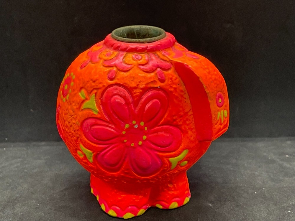 Figural pig candle holder made in Japan for Hallmark and dated 1969. Painted in an Orange, Pink and Yellow neon/florescent FLOWER POWER-Hippie design. 3.75" high - 3.5" wide.