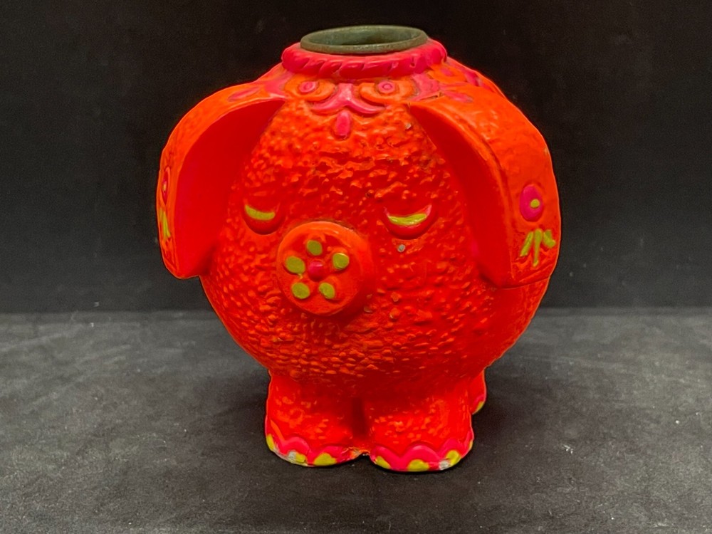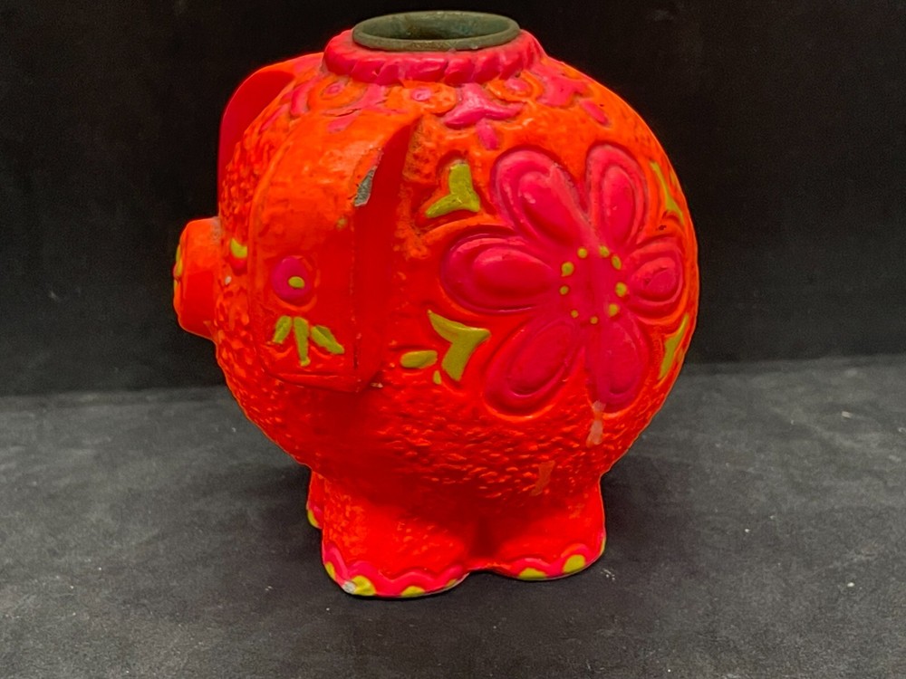 Figural pig candle holder made in Japan for Hallmark and dated 1969. Painted in an Orange, Pink and Yellow neon/florescent FLOWER POWER-Hippie design. 3.75" high - 3.5" wide....