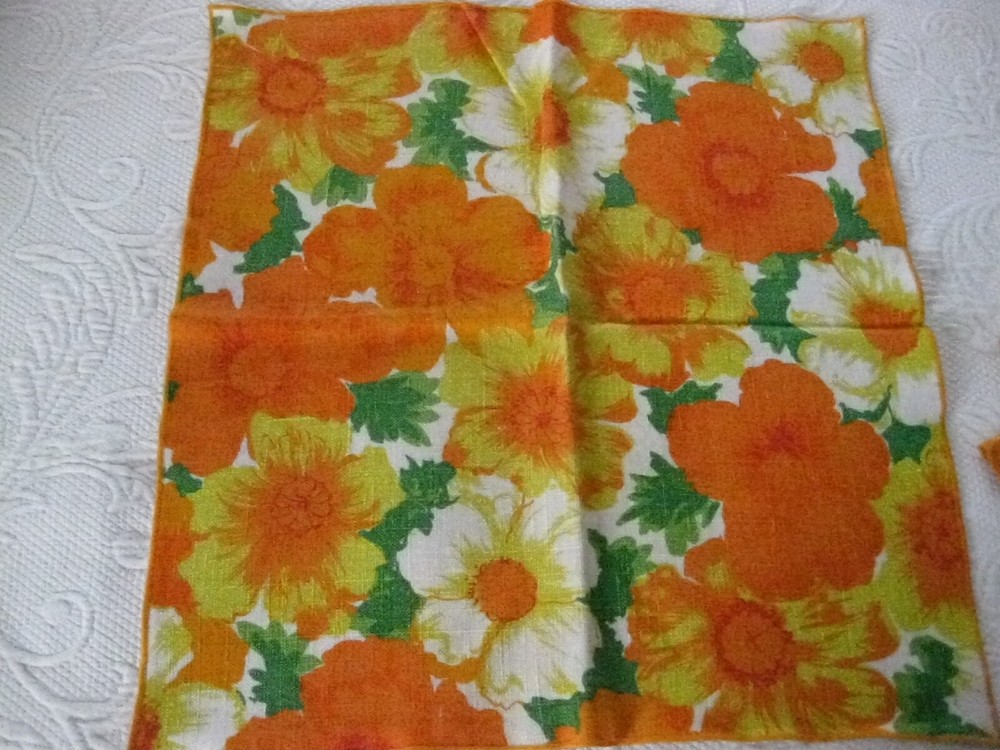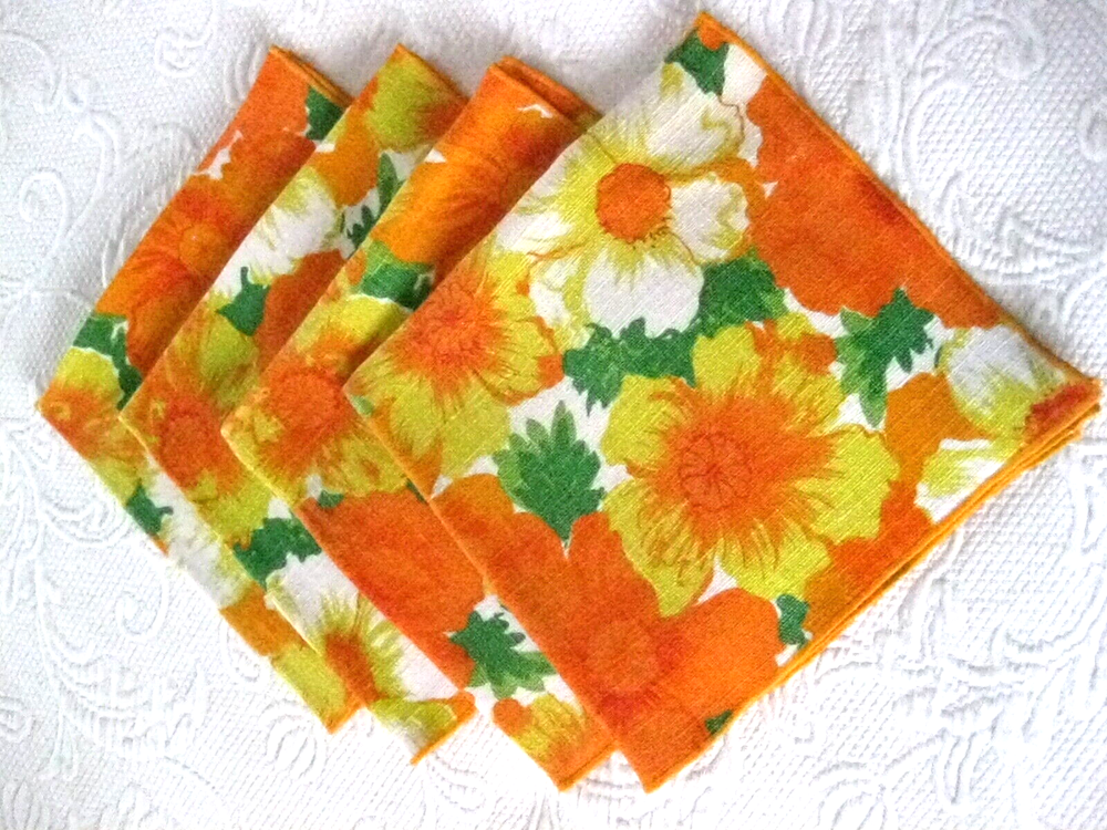 Vtg 1970s MCM Set of 4 Retro Orange Yellow Green Mid Century Modern Napkins approx...16" x 16"....linen blend.... from our family collection.... very good to nice vintage condition....smoke free.... #...