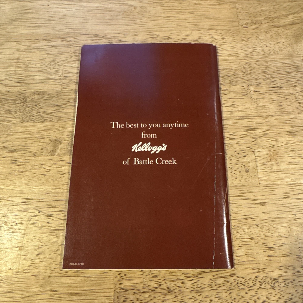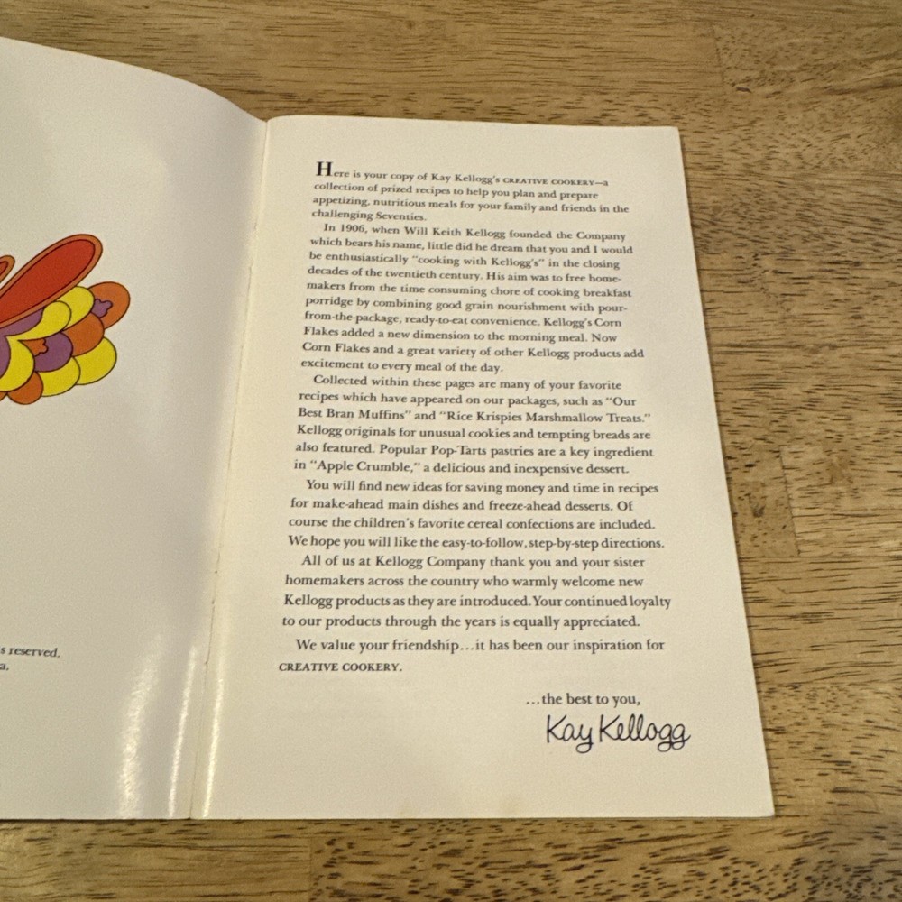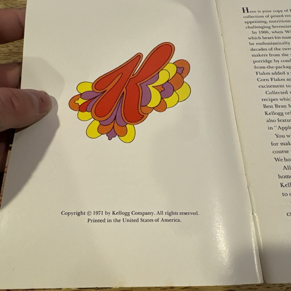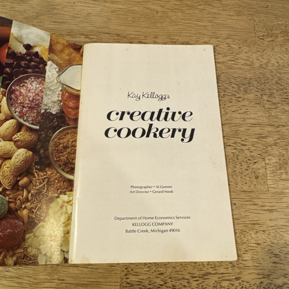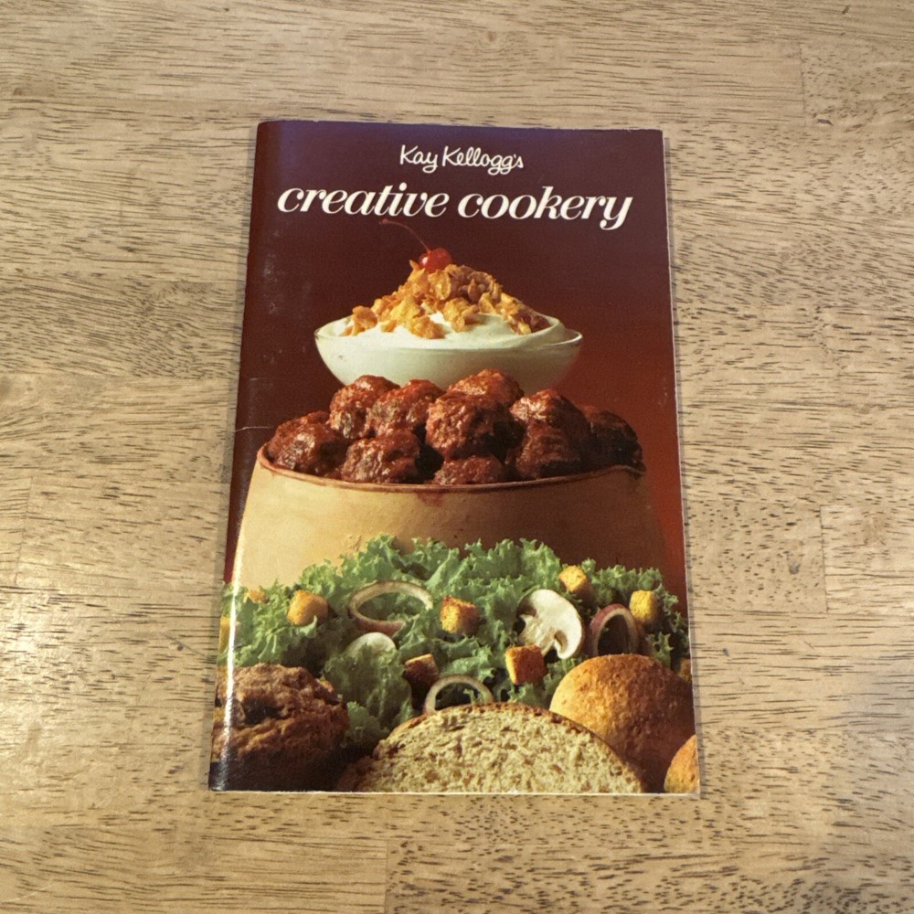 The product is a 1971 Kellogg's Creative Cookery recipe booklet, featuring main dishes and bakes. Created by Kellogg, the booklet showcases a multi-color design with a theme centered around cereal. It is an original item from the United States, serving as a collectible piece of advertising from the Kellogg brand. The booklet offers a unique glimpse into the culinary uses of Kellogg's products during that time period.