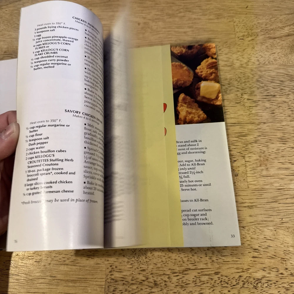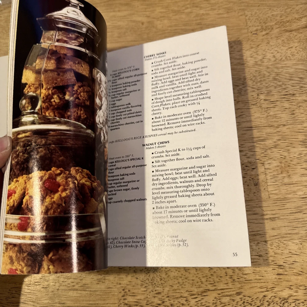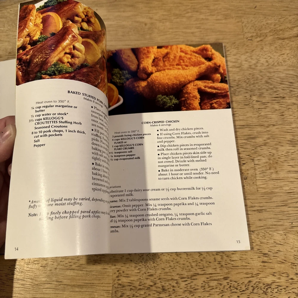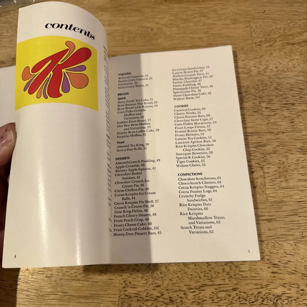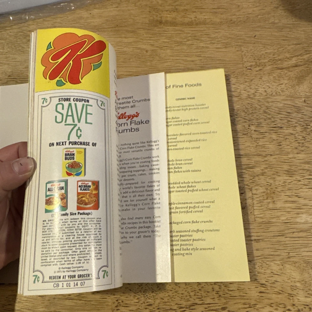 The product is a 1971 Kellogg's Creative Cookery recipe booklet, featuring main dishes and bakes. Created by Kellogg, the booklet showcases a multi-color design with a theme centered around cereal. It is an original item from the United States, serving as a collectible piece of advertising from the Kellogg brand. The booklet offers a unique glimpse into the culinary uses of Kellogg's products during that time period.