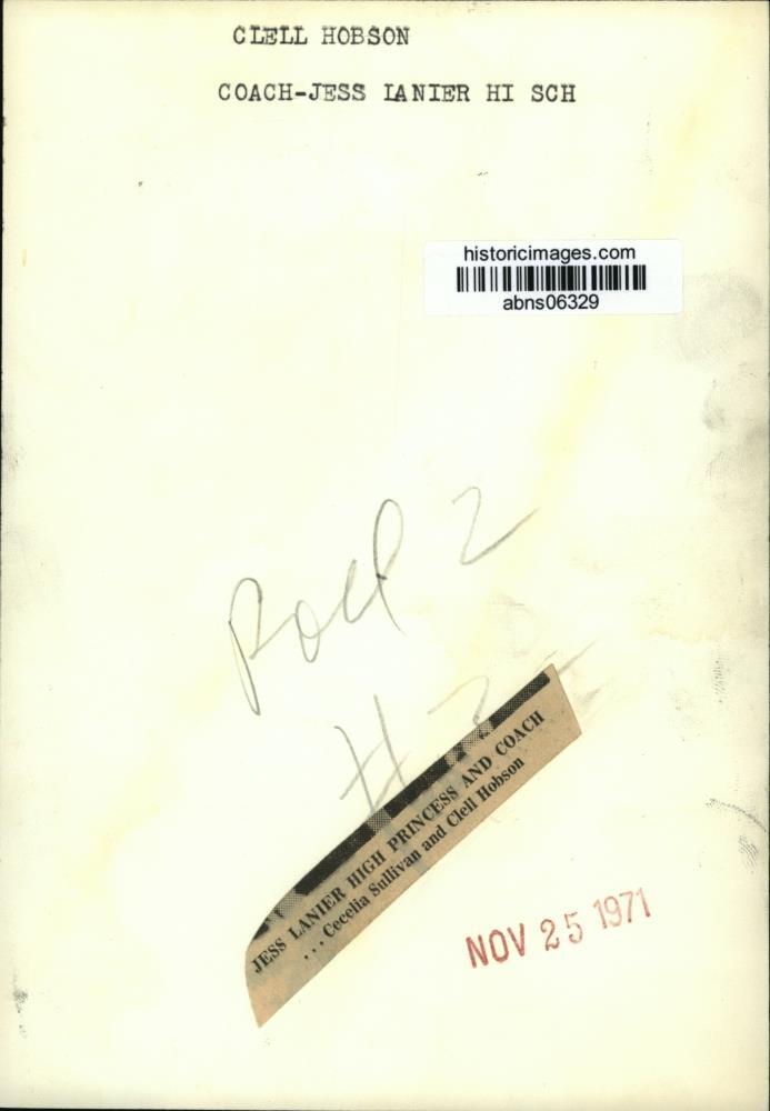 ebay template Note: Please study the images carefully to determine the condition of this vintage photograph, as it may not be in perfect condition. It may contain wrinkles, cracks, and possibly even tears due to its age and how it was handled before it got to us. A scanner may interpret colors and contrast differently than human eyes will, so it is possible that the actual photograph may be slightly darker or lighter in person. This vintage photograph is offered for sale as a collectible item and conveys no transfer of copyright. 1971 Press Photo Cecelia Sullivan & coach Clell Hobson, Jess Lanier High School This is an original press photo. Clell Hobson Coach Jess Lanier High School. Jess Lanier High Princess and Coach... Cecelia Sullivan and Clell Hobson Photo measures 5.25 x 7.5 inches. Photo is dated 11-25-1971. PHOTO FRONT PHOTO BACK Historic Images Part Number: abns06329 Sell Smarter with Kyozou. Inventory and Ecommerce Management