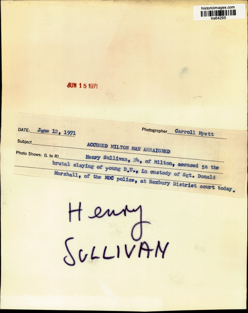 ebay template Note: Please study the images carefully to determine the condition of this vintage photograph, as it may not be in perfect condition. It may contain wrinkles, cracks, and possibly even tears due to its age and how it was handled before it got to us. A scanner may interpret colors and contrast differently than human eyes will, so it is possible that the actual photograph may be slightly darker or lighter in person. This vintage photograph is offered for sale as a collectible item and conveys no transfer of copyright. 1971 Press Photo Henry Sullivan in custody of Sgt. Donald Marshall of MDC police This is an original press photo. Henry Sullivan, 24, of Milton, accused in the brutal slaying of young B.U., in custody of Sergeant Donald Marshall, of the MDC police, at Roxbury District court today.Photo measures 8.25 x 10.5inches. Photo is dated 05-15-1971. PHOTO FRONT PHOTO BACK Historic Images Part Number: lra64265 FAQs Q: Can I just download a digital version instead? A: No, we sell only vintage originals and do not make or distribute any copies, including digital ones. Q: Do you combine shipping and invoices? A: Multiple photos won on the same seller ID combine automatically through the eBay checkout process. If you encounter problems with this, send us a message via eBay messaging and we will send you an invoice. Due to eBay limitations, we cannot combine items won on our different seller IDs for a single shipping charge. Q: How quickly do you ship the items once paid? A: We ship within one business day after your payment clears. If you do not receive an "order shipped" email from us by the close of the second business day from submitting payment, please e-mail us via eBay messaging. Q: How do you make sure my photograph arrives safely? A: We package each order between two cross-corrugated pieces of cardboard to ensure that the package is as difficult to bend as possible. We then wrap each order in a plastic sheet to help protect against moisture. We want you to rest assured that we take every precaution to ensure that the photograph you receive will be in the same condition in your care as it was in ours. Q: Will the "Historic Images" watermark be on my photo when I receive it? A: No. This is a digital watermark we use to protect our images. It is not printed on the photo. Q: What are your office hours? A: eBay for us is a business, and a very fun one to be in! We are open M-F 9 to 5 (CST). Therefore, we do not return e-mails and phone calls over the weekend. We observe the following holidays: New Years Day, Memorial Day, Fourth of July, Labor Day, Thanksgiving and the day after Thanksgiving, Christmas Eve and Christmas Day. Q: Where did all these vintage photos come from? A: These original vintage photographs are from various news service and newspaper photo archives from locations around the country including: Boston, Detroit, Tampa, Chicago, Denver, Seattle, New Orleans, Milwaukee, Portland, Spokane, and more. We do not copy or reproduce any photographs -- every item is a unique vintage piece that was housed in a news archive. Q: Can I use this photograph in my book/blog/website? A: The short answer is no. There is no transfer of copyright for republication or reproduction with these photographs when you purchase them, and only photographs taken before 1923 are currently automatically in the public domain. Permission from the copyright holder, which usually can be identified from the back of each photo, must be sought to republish or reproduce the image for any purpose. Q: Do you relist items (in case I miss an auction ending)? A: Auction items that receive no bids are relisted in our store (historicimages-store on eBay) as a fixed-price item and at a higher price than the starting auction price. Q: Do you leave feedback? A: Yes, we always leave feedback for buyers. Our software monitors when our buyers leave us feedback, then notifies us that we can leave feedback for the buyer. Rest assured, if you leave feedback, we will do the same! Check out our family of eBay IDs: historicimages01 Sports Photos historicimages02 Entertainment Photos historicimages03 Americana Photos historicimages04 International & War Photos historicimages05 Transportation Photos historicimages06 Photos of All Subjects historicimages07 Entertainment Photos historicimages08 Newsworthy Photos historicimages09 Entertainment Photos historicimages10 Sports Photos historicimages-store Our largest fixed-price selection historicimages-gallery Hand-picked photos Saturday night auctions About Us Historic Images was formed in September 2009, with a handful of scanners working out of a basement to digitize newspaper photo archives. We have since moved out of the basement, and we can now archive thousands of photos per day. Our company has worked with magazines and newspapers from Detroit, Boston, Denver, Seattle, Tampa, Chicago, and New Orleans, just to name a few. We are constantly adding to our inventory, and have assembled an archive of millions of photos to date. As our company evolved, we began our eBay business, which brings thousands of fresh auctions per week to the world's largest online auction marketplace. Our custom software systems and team of great employees allow us to efficiently scan and sell large photo archives online. At the very core of our company's DNA is a strong commitment to customer satisfaction and strict integrity for our product. Our promise to you is that we will do everything in our power to provide you a great buying experience. Copyright 2009 - Present, Historic Images, Inc. Sell Smarter with Kyozou. Inventory and Ecommerce Management