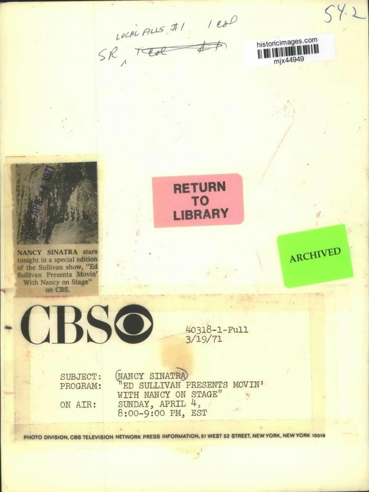 ebay template Note: Please study the images carefully to determine the condition of this vintage photograph, as it may not be in perfect condition. It may contain wrinkles, cracks, and possibly even tears due to its age and how it was handled before it got to us. A scanner may interpret colors and contrast differently than human eyes will, so it is possible that the actual photograph may be slightly darker or lighter in person. This vintage photograph is offered for sale as a collectible item and conveys no transfer of copyright. 1971 Press Photo Nancy Sinatra on "Ed Sullivan Presents" special on CBS This is an original press photo. Nancy Sinatra, "Ed Sullivan Presents Movin' with Nancy on Stage", Sunday, April 4, 8:00-9:00 PM, Eastern TimePhoto measures 7 x 9.25 inches. Photo is dated 03-19-1971. PHOTO FRONT PHOTO BACK Historic Images Part Number: mjx44949 Sell Smarter with Kyozou. Inventory and Ecommerce Management